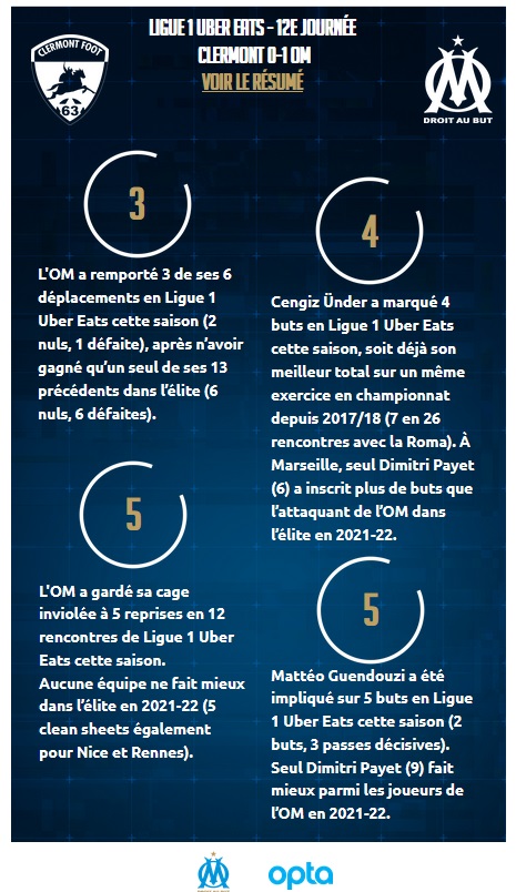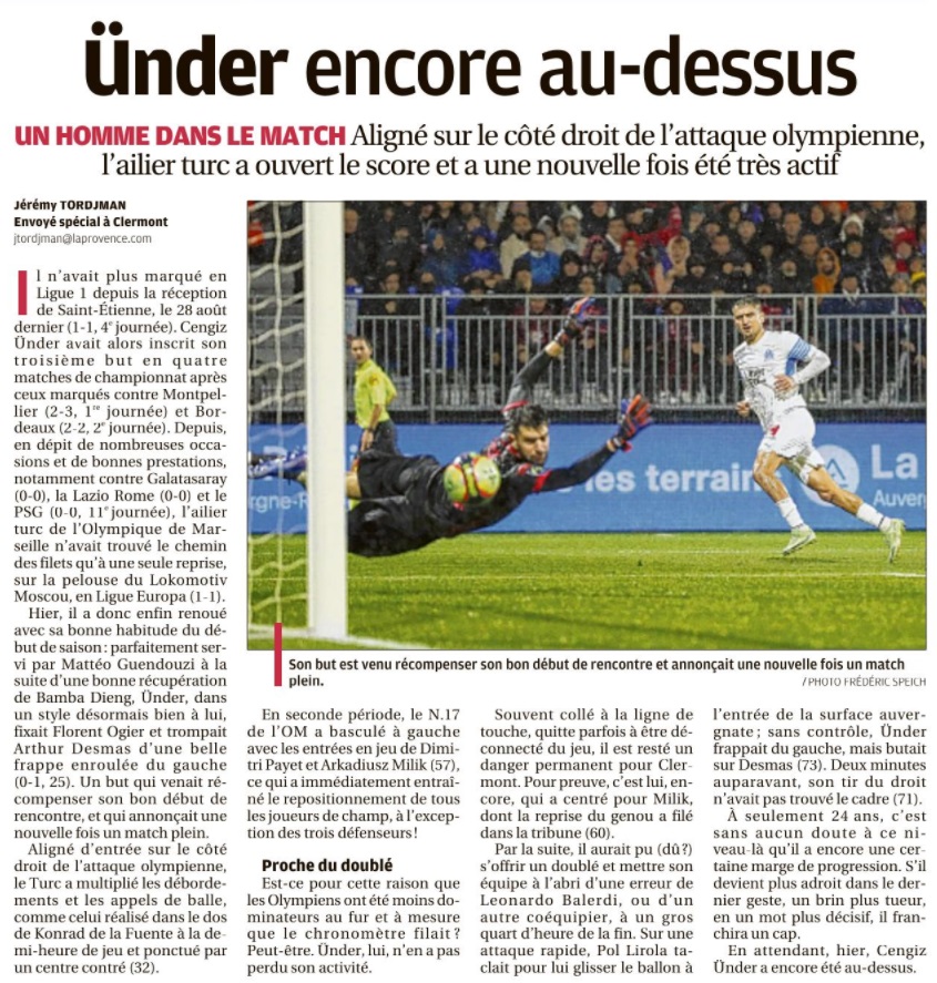 Clermont-OM (0-1) : l'OM sur le podium Avec son but inscrit en première mi-temps, Ünder a offert la victoire à l'OM qui monte sur le podium. Kamara récupère le brassard Pour affronter Clermont, Jorge Sampali a décidé de faire tourner son équipe. En effet, il a effectué pas moins de sept changements par rapport à la rencontre face à Nice. Le technicien argentin a pris la décision de faire souffler son capitaine, Dimitri Payet. Ainsi, c'est Boubacar Kamara qui récupérait le brassard. Peres, Balerdi, Lirola, Under, De la Fuente et Dieng étaient titulaires.