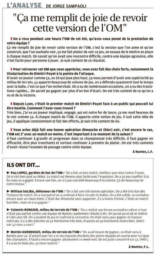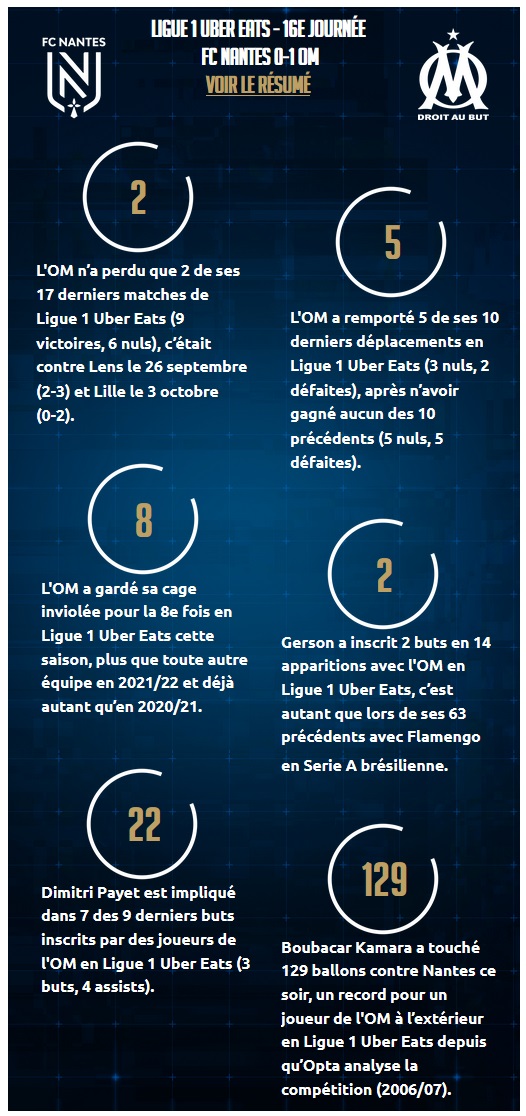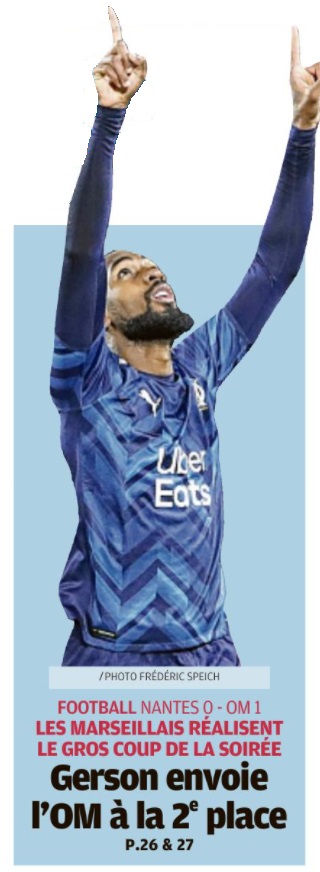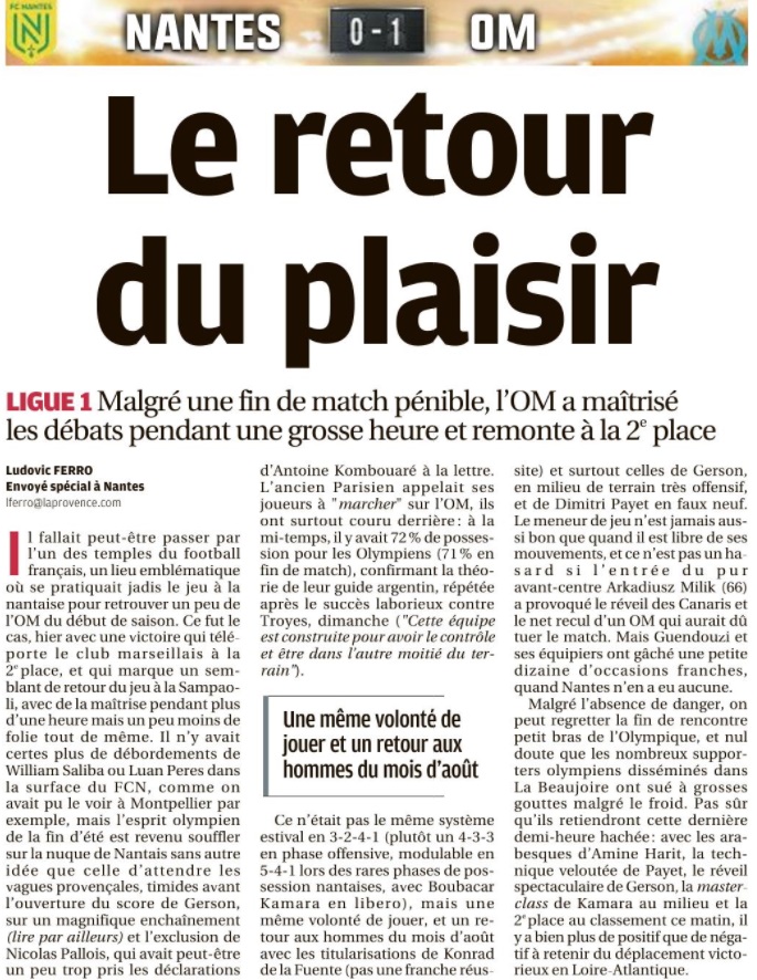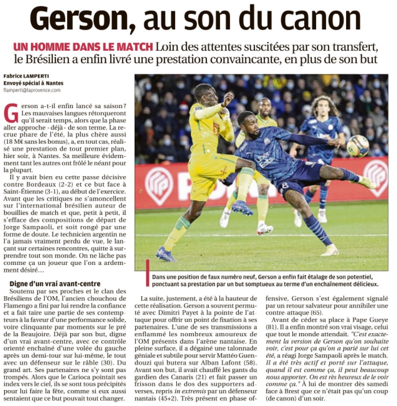 Nantes - OM (0-1) : La belle opération En s'imposant à Nantes sur un but de Gerson, l'OM a signé son second succès de rang en championnat. Une victoire qui permet aux Olympiens d'accéder à la deuxième place au classement. Sampaoli fait tourner L'OM enchaîne les matchs et les compositions d'équipe se suivent sans se ressembler. Par rapport au onze de départ de dimanche dernier face à Troyes à l'Orange Vélodrome, l'entraîneur argentin a effectué trois changements : Harit, Gerson et Kamara remplacent Lirola, Gueye et Milik. La composition de l'OM : Lopez, Saliba, Alvaro, Peres, Rongier, Kamara, Harit, Guendouzi, Gerson, De la Fuente et Payet avec le brassard de capitaine. Second but de Gerson Avant l'ouverture du score, l'OM a eu deux occasions en deux minutes. Un coup franc de Payet qui a frôlé le poteau gauche de Lafont et une reprise de Gerson, sur un centre de Harit, repoussée par le gardien nantais. À la demi-heure de jeu, le milieu de terrain brésilien a eu une seconde opportunité et il a fait mouche. Servi par Payet, Gerson a contrôlé la balle avant de frapper en pivot. Lafont était battu. Nantes réduit à dix La faute de Pallois sur Harit au quart d'heure de jeu a valu au Nantais un carton jaune qui a changé le cours du match car le défenseur des Canaris a joué ensuite avec une épée de Damoclès au-dessus de la tête. Moins de 20 minutes plus tard, le coup est tombé. Une grosse faute sur Payet et Eric Wattellier n'a pas hésité : un second jaune et donc une expulsion, juste après l'ouverture du score de Gerson. L'OM cherche à se mettre à l'abri En supériorité numérique et avec l'avantage au tableau d'affichage, l'OM a dominé la seconde période. Les Marseillais ont eu des opportunités de se mettre à l'abri en mettant le second but. Kamara par deux fois, de la tête puis du pied, n'a pas accroché le cadre. De la Fuente a également tiré à côté quelques minutes avant de laisser sa place à Milik. Sampaoli a également fait entrer Lirola, buteur contre Troyes, et Gueye dans les dernières minutes. Lancé par le Polonais, Guendouzi a manqué son duel avec Lafont à cinq minutes du terme. Gueye a lui aussi tenté sa chance. En vain. Le bon coup Après Troyes dimanche dernier, l'OM a enchaîné un second succès consécutif en Ligue 1 Uber Eats. Ces six points pris en deux journées et les résultats des rivaux directs (défaite de Rennes, nul de Nice) permettent aux Marseillais de pointer à la deuxième place au classement. Avant de recevoir Brest, samedi à 17 heures à l'Orange Vélodrome, l'OM compte 29 points et un match en moins. Les Marseillais devancent Rennes (28 points) et Nice (27 points). |