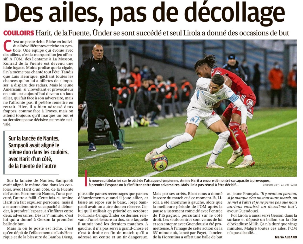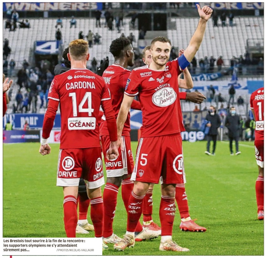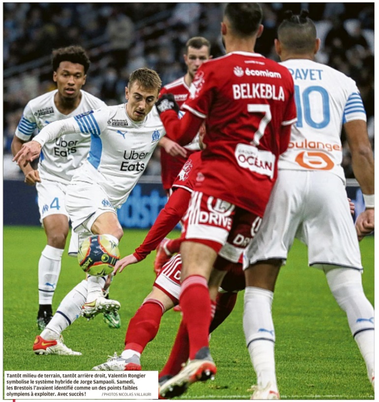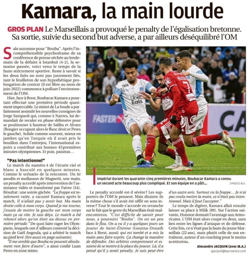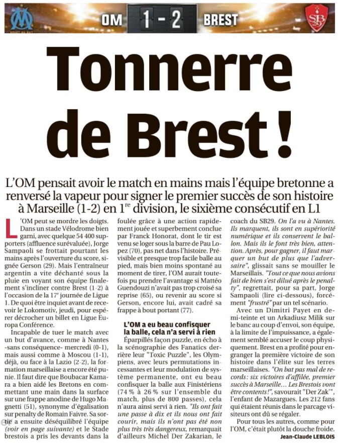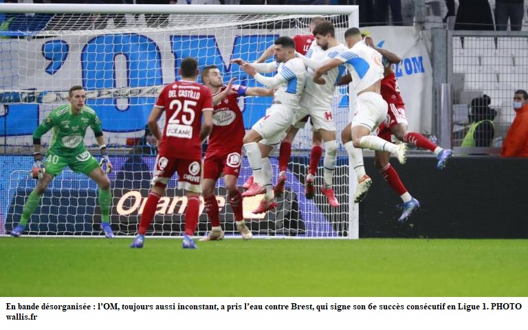 Les Olympiens avaient l'occasion de signer un troisième succès consécutif face à Brest. Mais, malgré l'ouverture du score de Gerson, ils ont été rejoints puis dépassés au score par les Bretons. Le même onze C'est assez rare pour être souligné. Avec l'enchaînement des rencontres Jorge Sampaoli a pris l'habitude d'effectuer une rotation dans son onze de départ. Il y a pu avoir entre deux parties jusqu'à sept changements au plus fort de la répétition des rencontres. Face à Brest, le technicien argentin a pourtant aligné la même équipe que lors du dernier match, à Nantes mercredi dernier (0-1). Le seul changement est intervenu sur le banc avec Ünder qui a pris la place de Targhalline. Gerson, encore ! Grosse entame de rencontre de la part des Olympiens qui ont tout de suite pris à la gorge leur adversaire. Privés de ballon, les Bretons se sont recroquevillés en défense et ont fait le dos rond avant de sortir un peu la tête de l'eau principalement sur des contres. La première occasion est venue de Gerson après un mouvement à trois avec Guendouzi au départ et un centre en retrait de Harit pour le Brésilien dont la frappe du gauche a été repoussée par Bizot (7'). Le gardien brestois ne pouvait en revanche rien faire sur un nouveau tir de Gerson peu avant la demi-heure de jeu. Après un une-deux avec Payet, le Brésilien conduisait à merveille sa balle, s'enfonçait dans la surface puis claquait un missile sous la barre (29'). Buteur en milieu de semaine à Nantes, Gerson a récidivé à domicile contre Brest. Brest revient sur penalty... À la 52e minute une frappe de Del Castillo était déviée dans la surface de réparation bien involontairement de la main par Kamara, masqué au départ. Les Bretons réclamaient immédiatement le penalty. L'arbitre sifflait et demandait l'assistance du VAR qui confirmait la faute. Faivre se chargeait de transformer le penalty et remettait les deux équipes à égalité. ...Et prend l'avantage En moins de 20 minutes, Brest a pris les devants au tableau d'affichage. Remis sur les bons rails après le penalty, les Bretons sont passés devant à la faveur d'un but d'Honorat bien décalé par une talonnade à l'entrée de la surface de Le Douaron. Le tir puissant d'Honorat heurte la transversale et entre dans les buts à la stupéfaction des spectateurs. L'OM tente de revenir Avant le second but brestois, Guendouzi avait eu une belle opportunité de marquer, bien servi par Lirola mais la reprise de l'ancien Gunner passait de peu à côté. A 2-2, une frappe de Gerson a connu le même sort à la suite d'un léger cafouillage dans la surface des hommes de Michel Der Zakarian. Les Olympiens, qui ont enregistré les entrées de Milik et Ünder, tentaient le tout pour le tout afin de revenir au score quitte à se découvrir. Les vagues blanches se heurtaient à la digue rouge et les contres des visiteurs se montraient parfois très dangereux. Mais le score en restait là... Les Marseillais n'enchaînent donc pas un troisième succès de rang en L1 et se retrouvent à la merci des résultats de leurs poursuivants (Rennes, Nice et Lens) dans la lutte au podium.