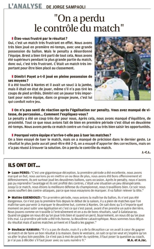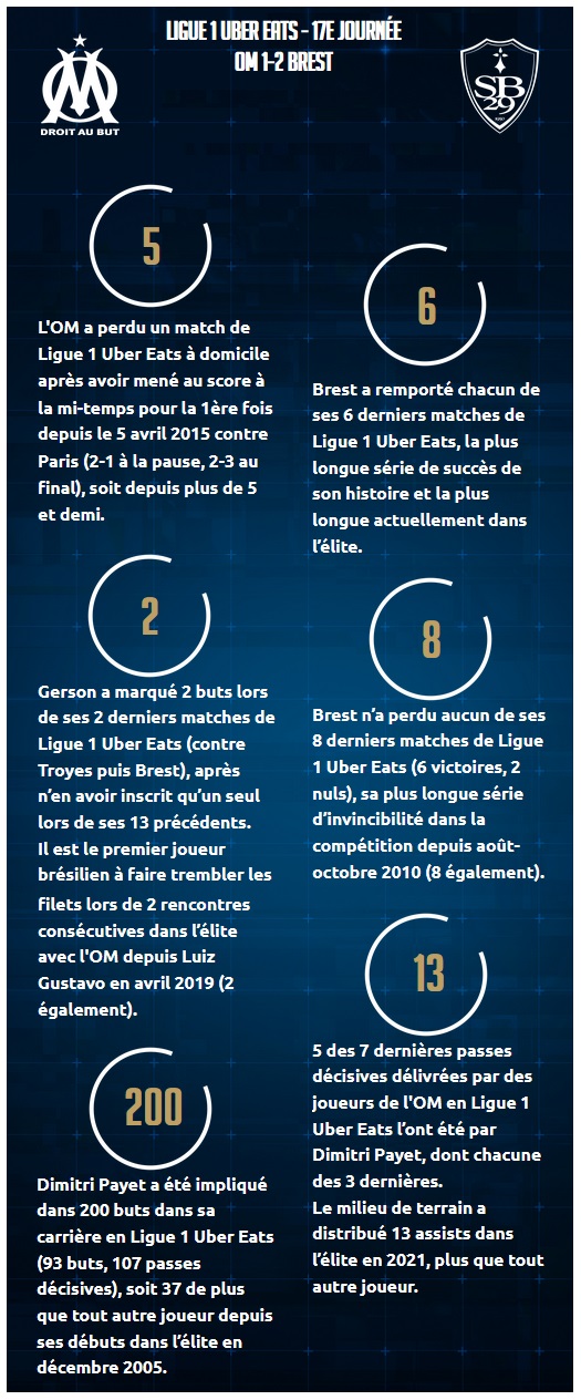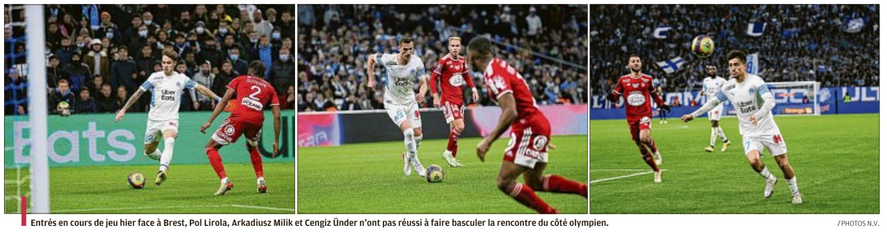 L'OM pris dans les filets brestois Alors qu'ils menaient au score à la mi-temps, les Olympiens ont été surpris par Brest à domicile ce samedi (1-2) en ouverture de la 17e journée de Ligue 1. Leur 2e place est en danger. Six jours après leur pâle succès contre Troyes (1-0) à huis clos, les Marseillais ont retrouvé la ferveur du Vélodrome et leur jeu enthousiaste. Oui, mais après deux succès étriqués en quatre jours (Troyes, Nantes) ils ont aussi retrouvé l'amer goût de la défaite, piégés par une équipe brestoise qui a su profiter de ses maladresses (main de Kamara dans la surface) et de son incapacité à reprendre le contrôle d'un match qui lui tendait les bras. Au classement, l'OM reste 2e (29 pts, un match en moins) avant les neuf autres matches de la 17e journée de Ligue 1. Mais il peut être dépassé d'ici dimanche soir par Rennes, Nice et Lens. De son côté, le Stade Brestois remonte à la 6e place (24 pts), fort d'une série de six victoires consécutives en championnat. La compo : sans Milik en pointe Comme il l'avait fait à Nantes mercredi, Jorge Sampaoli s'est volontairement privé d'un attaquant de métier comme Arek Milik, préférant laisser Dimitri Payet en " faux neuf ". Le Réunionnais a parfois permuté avec Mattéo Guendouzi (un peu) et Gerson (beaucoup). Konrad de la Fuente et Amine Harit en ont fait autant sur les ailes. En revanche, l'entraîneur argentin a réinstallé une défense à quatre avec Valentin Rongier à droite, même si l'ancien Nantais avait aussi la charge de repiquer au centre en phases d'attaque. En phase défensive, Bouba Kamara avait pour mission de s'intercaler entre les deux centraux. Après l'égalisation brestoise, Sampaoli a changé ses ailiers en lançant Pol Lirola et Cengiz Under. Puis il a fait entrer Arek Milik à la place de Bouba Kamara, un choix qui s'est avéré mauvais tant il a désorganisé son équipe. Brest a opposé un 4-2-3-1 aux lignes rapprochées. La formation de Michel Der Zakarian n'a pas cherché à fermer le jeu, mais elle ne s'est pas non plus découverte après l'ouverture du score olympienne et a constamment subi le jeu jusqu'au penalty (un peu tombé du ciel) donné par Gaël Angoula, l'ancien joueur pro qui a remplacé Antony Gautier (blessé à l'entraînement) au pied levé. Elle a ensuite usé des contres pour estoquer les locaux. Le jeu : l'OM va de l'avant... et se ramasse Le doute était permis depuis quelques semaines. Mais après des rencontres plutôt ternes car trop empreintes de sagesse, les Olympiens ont remis le pied sur l'accélérateur depuis leur succès à Nantes (1-0) mercredi. Face à Brest, les Marseillais ont étouffé leurs adversaires pendant un quart d'heure, même si leur pressing tout terrain n'a pas été récompensé au tableau d'affichage (frappe de Gerson sur Bizot, 7e). Ils ont ensuite légèrement desserré l'étau tout en conservant largement la possession du ballon et du terrain. Mais dominer n'est pas marquer, et encore moins gagner. Les Phocéens ont finalement peu inquiété Marco Bizot, et quand ils l'ont fait, ils ont pêché par manque de réalisme. Comme souvent cette saison, la fin de match a ressemblé à du hourra-football, chaque mauvaise passe marseillaise aboutissant à un contre finistérien. Le match : l'OM perd le fil après l'égalisation bretonne Les Marseillais ont confisqué le ballon à leurs adversaires pendant 90 minutes mais ils se sont peu à peu désunis. Ils ont dû attendre la demi-heure de jeu pour ouvrir le score sur un une-deux entre Gerson et Payet. Ils ont été rejoints à l'heure de jeu sur un penalty de Roman Faivre consécutif à une main involontaire de Bouba Kamara dans sa surface. Suite à l'égalisation bretonne, l'OM a perdu le fil, même si Mattéo Guendouzi a manqué une reprise aux 6 mètres sur un centre de Pol Lirola (64e). Les entrées en jeu de l'Espagnol, mais aussi de Cengiz Under et Arek Milik, devaient apporter plus de danger en attaque. C'est le contraire qui s'est produit, les contres brestois étant de plus en plus tranchants et nombreux. Celui initié et conclu par Franck Honorat, relayé par Jérémy Le Douaron, a fait mouche (71e). Laurent Cardona aurait même pu en convertir un autre (81e). Les joueurs : Gerson confirme, Payet à l'économie Symbole de cet OM qui repart vers l'avant, Gerson a signé sa deuxième belle prestation de la saison après celle de Nantes il y a trois jours, et a inscrit un nouveau but. L'international brésilien, très souvent positionné à la pointe de l'attaque, a aussi participé au pressing marseillais, n'hésitant pas à chasser les attaquants brestois jusque devant sa surface de réparation (65e) ou dans leur surface (77e). Mais son regain de forme n'a pas suffi. Plus curieuse a été l'attitude de Dimitri Payet. Le capitaine marseillais était incertain vendredi. Il a tenu sa place mais a semblé jouer à l'économie, laissant même les coups de pied arrêtés à Amine Harit puis Cengiz Under. Pourtant, c'est encore de lui qu'est venu le danger avec un une-deux parfaitement exécuté avec Gerson sur l'ouverture du score (29e) et deux passes lumineuses pour Lirola et Gerson (59e, 60e, 65e). Au rayon des déceptions, Amine Harit a fait un début de match prometteur avant de disparaître et Konrad de la Fuente, volontaire, a multiplié les mauvais choix. Les entrants, en dehors peut-être de Lirola, n'ont pas apporté la grinta attendue. Alors que le couloir gauche olympien était ciblé dans les précédentes rencontres par ses adversaires, c'est du côté droit que l'OM a pris le bouillon en contre cette fois. En seconde période, difficile de différencier les prestations individuelles de la prestation collective : tous les joueurs ont perdu leur lucidité et ont accumulé maladresse dans le geste comme dans le placement.