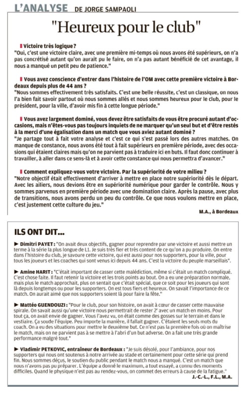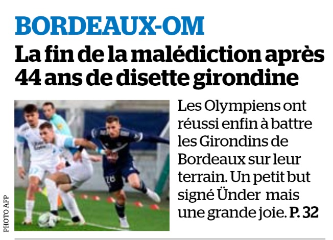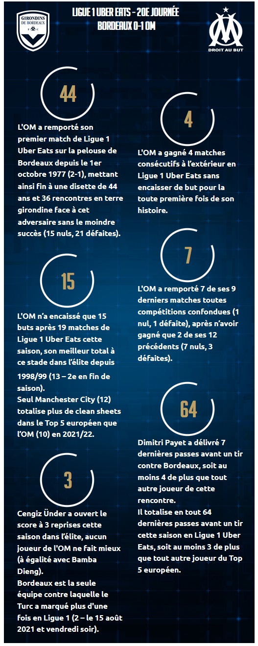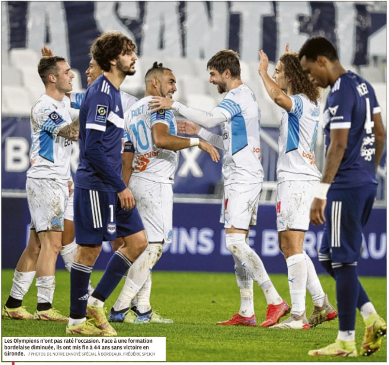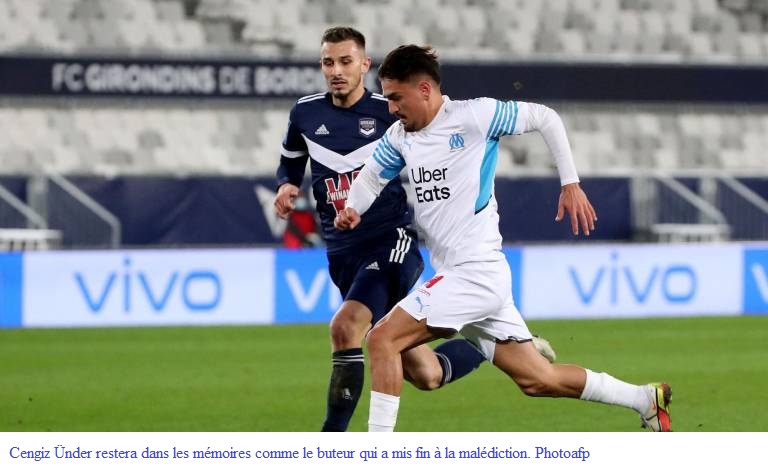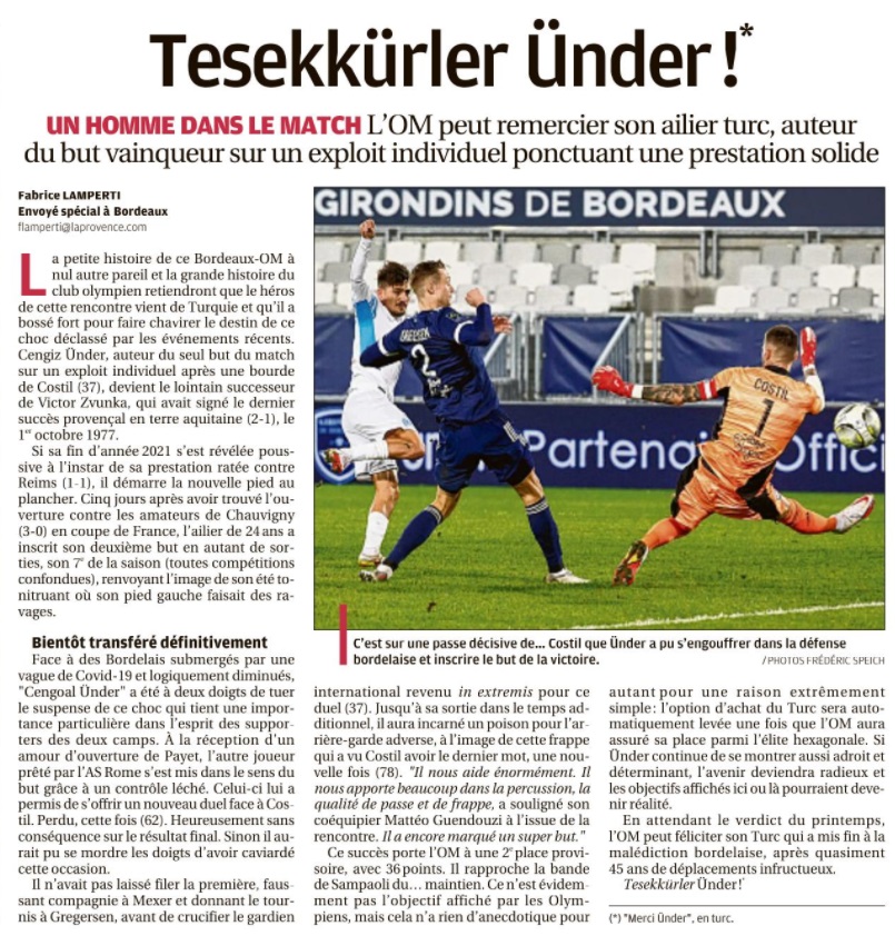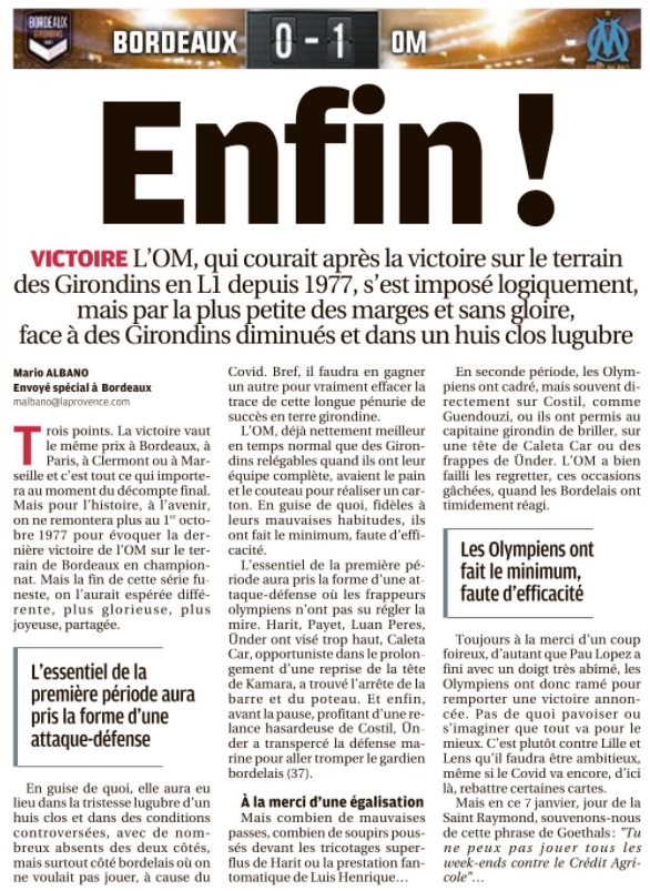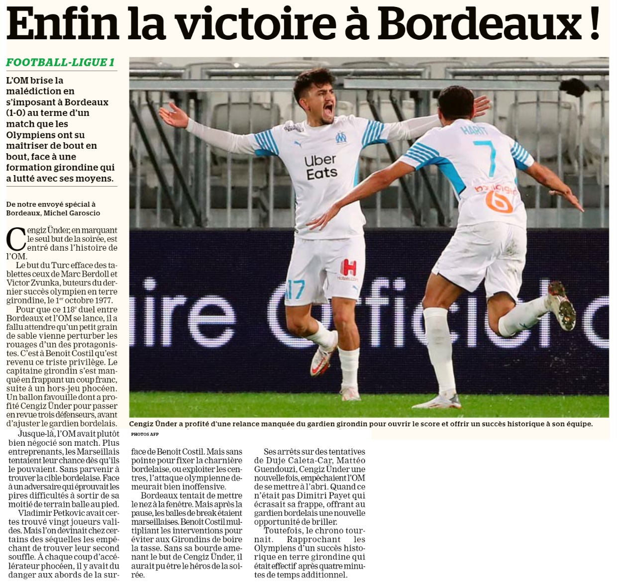 Bordeaux - OM (0-1) : La fin du signe indien Après 44 ans sans succès à Bordeaux, l'OM de Jorge Sampaoli a réussi à s'imposer sur la pelouse des Girondins grâce à un but de Ünder. La fin de la série noire. La compo marseillaise Covid, blessures, CAN... Jorge Sampaoli a jonglé avec les absences pour le premier match de Ligue 1 Uber Eats de l'année 2021 pour l'OM. Pourtant, le technicien argentin n'a fait que 3 changements dans son onze de départ par rapport à l'équipe alignée contre l'US Chauvigny. Lopez, Lirola et Harit ont remplacé Lopez, Gerson et Milik. Ünder ouvre la marque Lors de la première période dominée par l'OM, les occasions étaient marseillaises avec Harit, Payet et Peres qui n'avaient pas trouvé le cadre. Caleta-Car avait lui touché la barre sur un corner de Payet dévié de la tête par Kamara. Puis sur une mauvaise relance de Costil, Ünder a récupéré la balle. Lancé à pleine vitesse dans l'axe, l'international turc a passé en revue la défense bordelaise avant de croiser sa frappe pour tromper Costil. Cela faisait 307 minutes que l'OM n'avait pas trouvé le chemin des filets lors d'un Bordeaux-OM, depuis le but de Morgan Sanson à la dernière minute du match de la saison 2017-2018. L'OM ne plie pas le match Jorge Sampaoli avait souligné ce point lors de la conférence de presse vendredi à 48 heures du match. L'OM a parfois du mal à aggraver le score, à tuer le match et éviter de trembler dans les dernières minutes. Au retour des vestiaires, les Marseillais ont essayé mais ont buté sur Costil, probablement vexé de son erreur qui a amené le but de Ünder. Caleta-Car de la tête sur un coup franc de Payet, puis Guendouzi ou Ünder, idéalement lancé par Payet et Payet lui-même ne sont pas parvenus à mettre le second but. La fin de la malédiction Le succès olympien grâce à un but de Ünder à la 37e minute est historique. Cette victoire est la première de l'OM sur la pelouse bordelaise en championnat depuis le 1er octobre 1977 (1-2). C'est la fin de plus de 44 ans sans victoire pour l'OM à Bordeaux, pour un total de 36 rencontres (15 nuls et 21 défaites). L'histoire retiendra que la malédiction marseillaise à Bordeaux a pris fin le 7 janvier 2022 par l'équipe de Jorge Sampaoli. L'OM assure sa place sur le podium C'est l'avantage de jouer en premier, ce qui n'arrive pas souvent à l'OM cette saison puisque les Olympiens ont souvent jouée le jeudi en Europa League. En s'imposant à Bordeaux, les hommes de Jorge Sampaoli ont sécurisé leur place sur le podium avant les autres matchs de la journée. Les Olympiens sont deuxièmes et seul Nice, qui de déplace à Brest, est en capacité de repasser devant. |