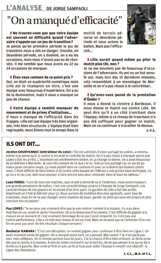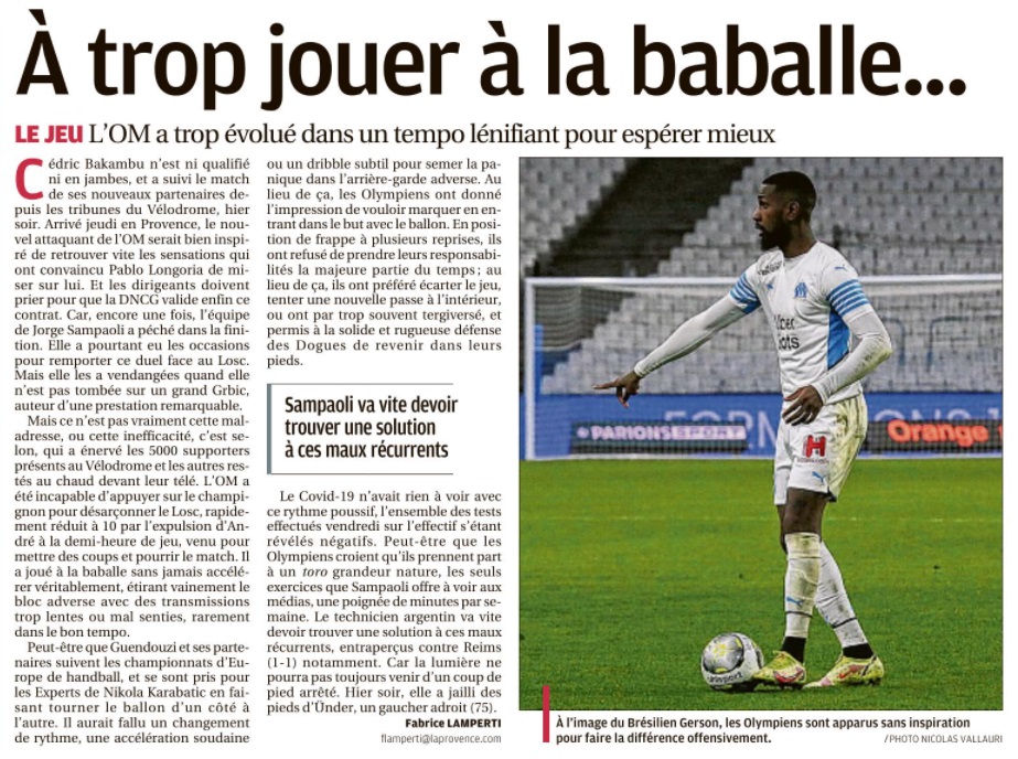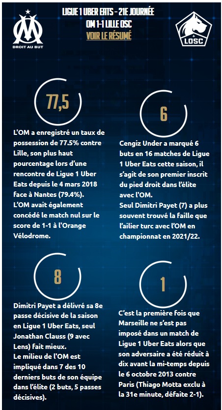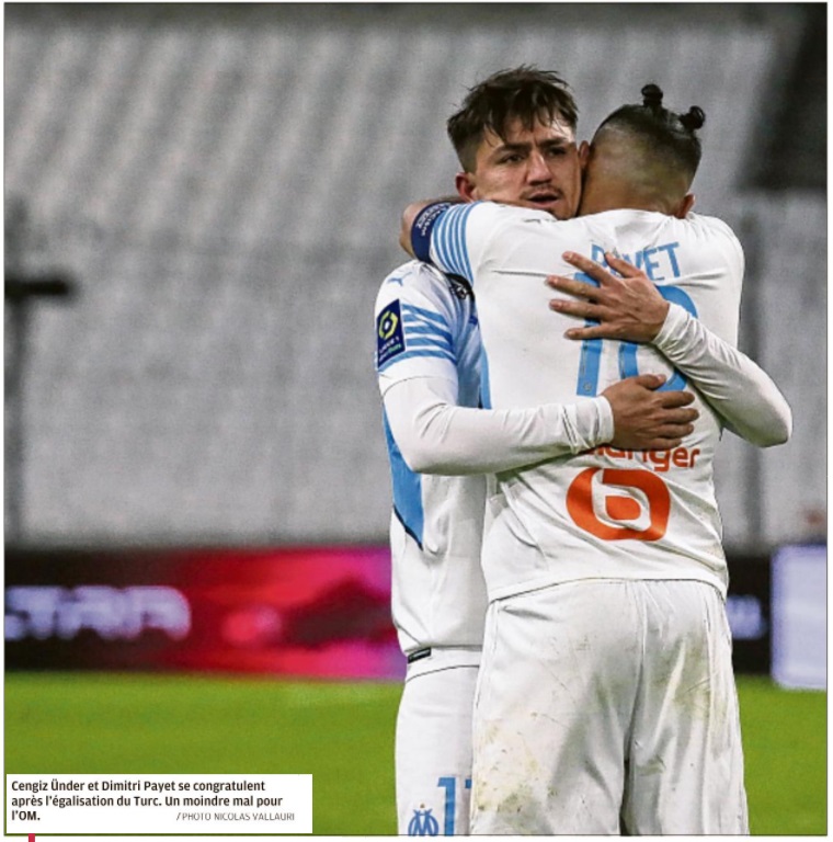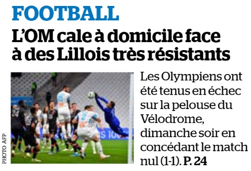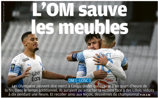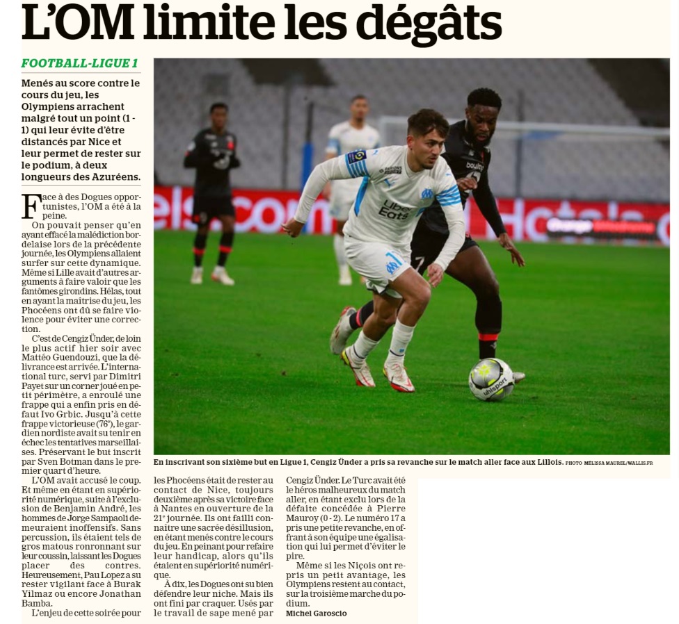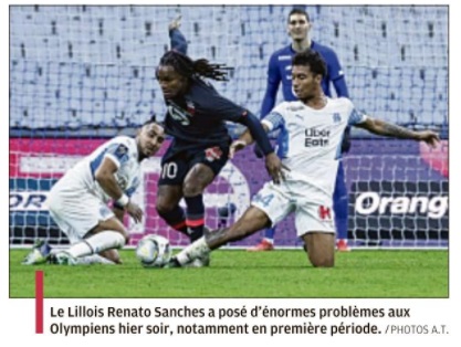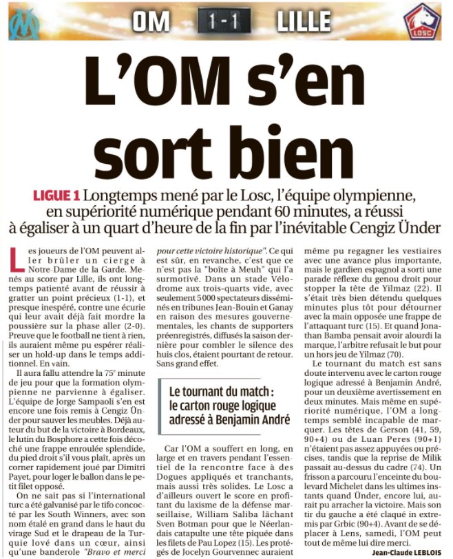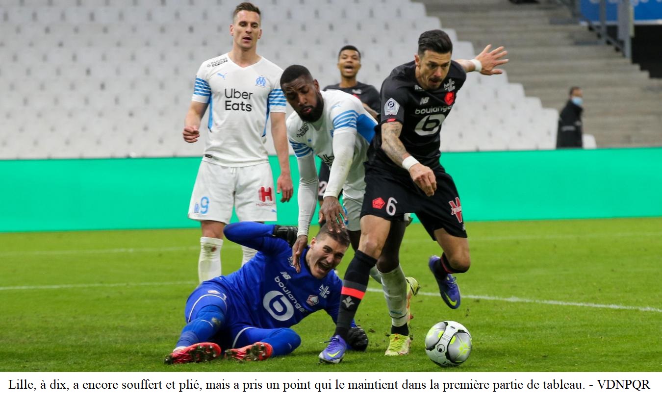 Ligue 1 : à Marseille, le LOSC se contentera d'un point En infériorité numérique pendant une heure avec l'expulsion de Benjamin André, les Lillois n'ont pas réussi à préserver leur avantage sur la pelouse marseillaise. Sven Botman avait en effet ouvert le score en reprenant de la tête un corner de Renato Sanches. Mais Cengiz Ünder a trouvé une faille. Assis toute la seconde période aux côtés de ses dirigeants, Benjamin André a certainement ressassé ces deux minutes où il a perdu ses nerfs, autour de la demi-heure de jeu. Averti pour contestation (30e), le milieu de terrain a craqué sur l'action d'après en perdant un ballon avant de faucher Guendouzi à l'entrée de sa surface (32e). Son expulsion le privera de la réception de Lorient, mercredi, mais aurait pu avoir des conséquences plus graves pour son équipe. À onze contre onze, les Lillois avaient parfaitement attaqué ce choc de la Ligue 1... Néanmoins, le LOSC a affiché d'énormes qualités de solidarité durant l'heure suivante pour ne pas repartir bredouille de Marseille. Prendre un point dans ces conditions, chez un candidat à la Ligue des champions, reste au final une performance positive pour des Nordistes, désormais invaincus depuis huit journées (trois victoires, cinq nuls). Mais, il y a vraiment eu deux matchs, ce dimanche soir, dans ce Vélodrome qui sonnait bien creux pour l'occasion. Du rythme d'entrée À onze contre onze, les Lillois avaient parfaitement attaqué ce choc de la Ligue 1. Jocelyn Gourvennec était resté dans un schéma classique, en 4-4-2. Seule surprise, il avait décidé de titulariser Amadou Onana, dans l'axe et replacé Renato Sanches sur le côté droit. Edon Zhegrova, la dernière recrue nordiste, n'était pas encore qualifiée. Le dernier document de la Fédération suisse est attendu aujourd'hui du côté de Luchin. Le LOSC - y compris les joueurs récemment positifs au Covid (Yilmaz, Fonte - s'est tout de suite mis dans le rythme de la rencontre. Il ouvrait le score sur son premier temps fort. Pau Lopez a repoussé une frappe déviée de Burak Yilmaz (15e). Sur le corner qui suivait, signé Renato Sanches, le gardien de l'OM n'a rien pu faire sur cette reprise de la tête de Sven Botman (0-1, 15e). Lille était parfaitement lancé, avec un Amadou Onana sur la lignée de sa bonne performance en Coupe de France. Pau Lopez maintenait d'ailleurs son équipe en vie en se jetant devant Yilmaz (22e) ou en repoussant cette tentative de Jonathan Bamba (42e). Entre-temps, Benjamin André a disjoncté mais Lille, replacé en deux lignes de quatre derrière Yilmaz, a décidé de faire le dos rond. Marseille s'est réorganisé à la pause avec un Dimitri Payet plus mobile et plus axial. Ce fut alors au tour du gardien lillois de s'illustrer. Ivo Grbic n'avait pas attendu l'infériorité numérique avec cette double parade devant Payet et Guendouzi (29e). Cependant l'international croate, fut encore décisif à plusieurs reprises en seconde période. On retiendra surtout ces trois arrêts de rang dans le temps additionnel, juste après que Celik avait failli dégager dans son propre camp (90e+4). Le LOSC se contentera au final d'un point. En effet, à un quart d'heure de la fin, Cengiz Ünder, l'un des Marseillais les plus actifs, a quand même trouvé une faille (1-1, 75e). Avec 29 points, les Dogues sont toujours coincés au milieu du classement. Ils doivent absolument profiter de la venue de Lorient, mercredi, sur la nouvelle pelouse du stade Pierre-Mauroy, pour grappiller quelques places. Ça devient urgent quand on voit le rythme affiché un peu plus haut par Nice, Rennes, et Monaco. Auteur : Olivier Fosseux |