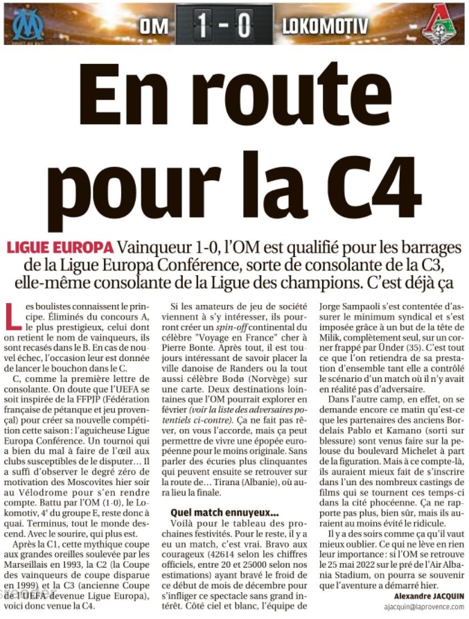 L'OM tiendra Conférence Les Marseillais ont facilement contenu le Lokomotiv Moscou (1-0) lors de la dernière journée de Ligue Europa. Ils seront donc reversés en Ligue Europa Conférence au mois de février. L'OM quitte la Ligue Europa par la moyenne porte. Pas par la grande, qui menait aux barrages ou aux 8e de finale de la compétition. Pas par la petite non plus, qui l'aurait renvoyé aux seules compétitions domestiques cet hiver. La moyenne, elle, s'ouvre vers un avenir européen via la plus petite des Coupes d'Europe : la Ligue Europa Conférence. Un match nul lui suffisait pour laisser le Lokomotiv Moscou derrière lui au classement du groupe E dans cette petite finale des perdants, dans cette " finale " tout court comme l'avait nommée Jorge Sampaoli mercredi. L'entraîneur argentin avait prévenu qu'il ne galvauderait pas l'accessit, il a tenu parole en faisant tourner son effectif, mais juste ce qu'il faut pour montrer qu'à trois jours d'un périlleux déplacement à Strasbourg, il ne se fichait pas de la tête du - maigre - public marseillais venu braver le froid provençal pour voir ce choc contre un Loko venu tout droit de l'hiver russe. Rassurant à défaut d'être emballant Organisé en 3-3-3-1 avec le revenant Steve Mandanda dans la cage et son attaquant-phare Arek Milik à l'autre bout du dispositif, l'OM n'a pas eu de mal à maîtriser le Lokomotiv Moscou. Milik a donné le premier coup de canon d'un retourné contré que Gerson n'a pu reprendre correctement (8e). Puis, comme à leur habitude, les locaux ont dominé sans se créer plus d'occasions que de raison, si ce n'est Milik (encore) pour une frappe dans les gants de Khudiakov (31e), une frappe contrée et mise en corner Pablo (34e) et enfin le but de la délivrance sur ledit corner (35e). Le Loko n'a pas eu le vice des équipes de Ligue 1 à vouloir prendre les Marseillais sur les ailes et dans leur dos. Ni même une grande envie. Il a fallu attendre l'exclusion de Valentin Rongier pour deux fautes bêtes en moins de vingt minutes pour voir Markus Gisdol sortir un défenseur (Pablo) pour un attaquant (Lisakovich). Trop tard, l'OM avait un but d'avance et la volonté de poursuivre son aventure européenne. Sans être emballant, ce match rassure les troupes après la défaite contre Brest (2-1) et avant le déplacement en Alsace dimanche. Auteur : Gael Biraud |