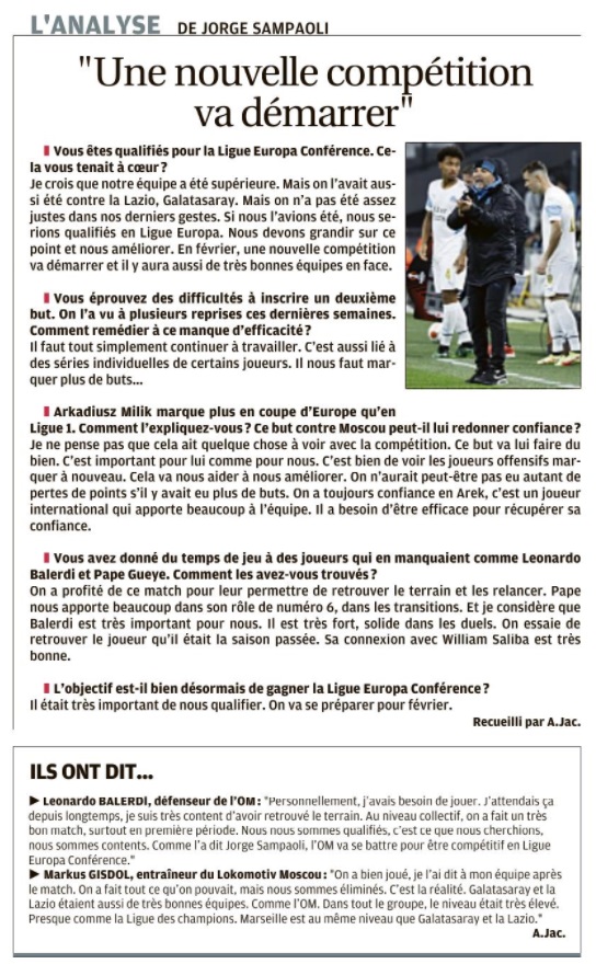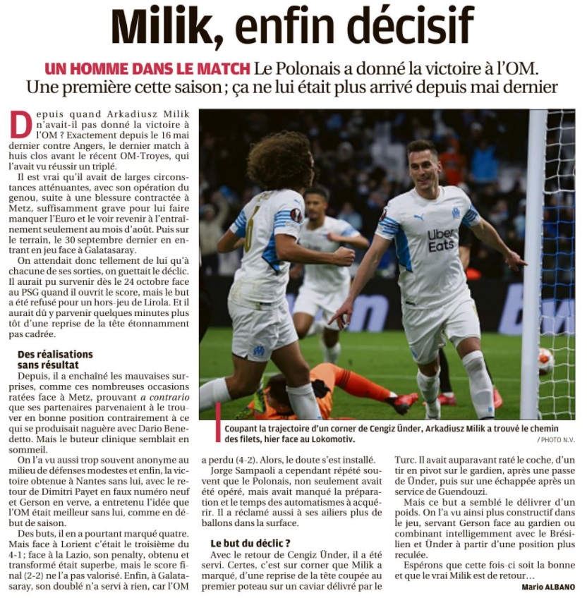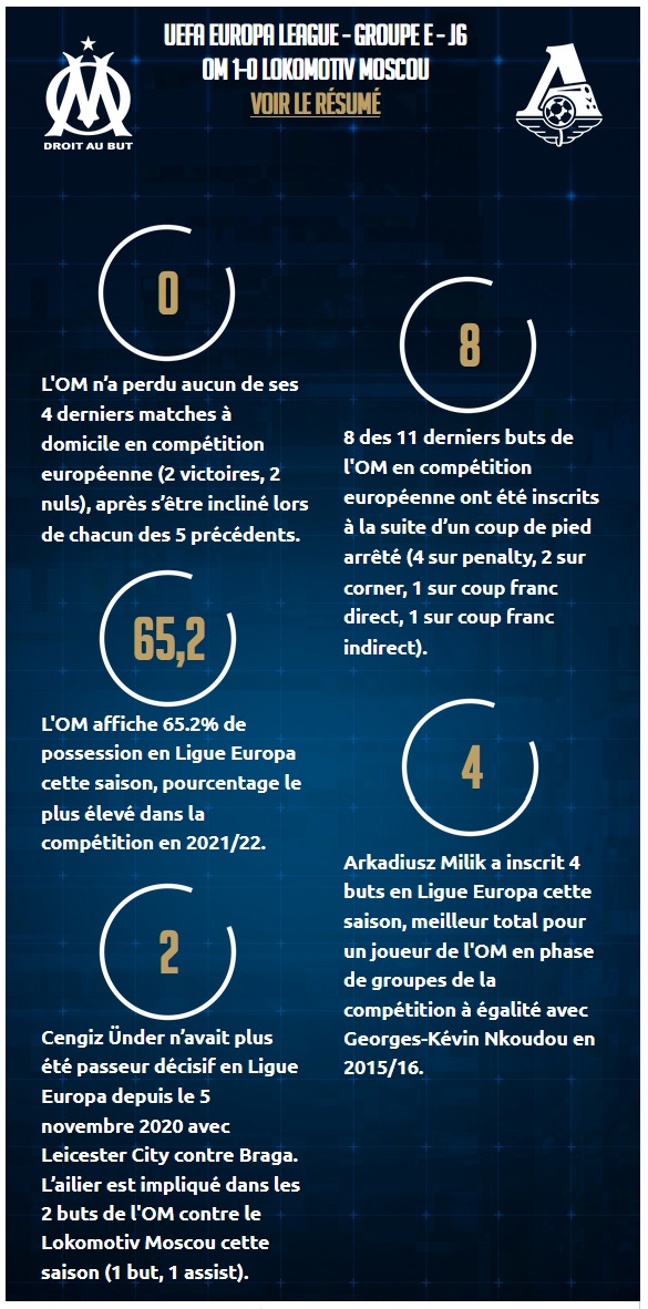 Les Marseillais ont signé leur premier succès de la saison en Europa League à domicile face au Lokomotiv Moscou grâce à un but de Milik. L'OM jouera les barrages de l'Europa Conference League en février. Le onze olympien En cette fin d'année 2021, Jorge Sampaoli continue la rotation dans son effectif. Par rapport au dernier match joué samedi à l'Orange Vélodrome face à Brest (1-2), le technicien argentin a effectué 5 changements : Mandanda, Balerdi, Gueye, Ünder et Milik ont remplacé Lopez, Alvaro, Kamara, Harit et Payet. Le brassard de capitaine est porté le gardien de but olympien, Steve Mandanda. La composition de l'OM : Mandanda, Saliba, Balerdi, Peres, Rongier, Guendouzi, Gueye, Gerson, Ünder, Milik et de la Fuente. Milik délivre les siens La possession était largement en faveur de l'OM en première période mais les tentatives olympiennes n'étaient pas assez tranchantes. Un tir de Gerson à côté, un coup franc d'Ünder qui passait devant le but russe sans que personne ne coupe la trajectoire du ballon (Balerdi s'est bien jeté mais il lui manquait quelques centimètres) et un tir en pivot de Milik capté par le portier russe. Comme souvent, c'est sur coup de pied arrêté que la différence a été faite. Un corner d'Ünder déposé sur la tête de Milik, qui s'était parfaitement défait du marquage moscovite pour tromper Khudiakov, et voilà l'OM qui concrétisait sa domination (35'). L'OM manque le break Les Marseillais ont eu plusieurs occasions de doubler la mise notamment par Gerson de la tête (51') ou encore après un bon ballon en profondeur de Milik (52'). L'opportunité la plus nette est intervenue à la suite d'un joli mouvement collectif. Sur un contre rondement mené, notamment par Guendouzi, la balle arrivait dans les pieds de Rongier lancé à pleine vitesse. Il glissait le ballon dans l'axe pour Gerson qui se retrouvait seul face au gardien russe. Le frappe du Brésilien était contrée par Khudiakov, la balle partait en cloche vers le but mais finissait sa course... sur la transversale. Les Olympiens finissent à dix Averti une première fois à la 63e minute du match, Valentin Rongier a reçu un second avertissement à 10 minutes de la fin du temps réglementaire. Une sanction synonyme d'exclusion pour le milieu de terrain marseillais qui a laissé ses partenaires en infériorité numérique pour la fin de match. L'OM reversé en Europa Conference League En terminant à la troisième place du groupe E d'Europa League, l'OM est reversé en Europa Conference League, compétition créée cette saison par l'UEFA. Les Olympiens disputeront donc un barrage les 17 (match aller) et 24 février (match retour) prochains face à l'un des deuxièmes de poules de Conference League. L'OM connaîtra son adversaire dès lundi 13 décembre puisque le tirage au sort aura lieu à 14 heures à Nyon au siège de l'instance européenne. |