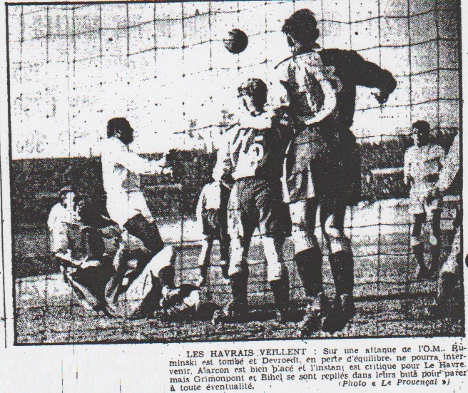 Dans les vestiaires on est satisfait du côté Havrais et Bigot de nous dire : "L'O.M. a mieux joué que nous, c'est une belle équipe, elle mérite de remonter nettement au classement il y en a devant elle qui ne la valent pas ! Je vous assure que j'ai eu chaud et je vous affirme que nous avons joué cette défense à outrance parce que les avants olympiens nous y ont obligé !" Roessler, bien entendu n'est qu'à demi satisfait et cela se conçoit aisément : "Nous n'avons pas eu beaucoup de chance et puis la défense havraise à abattu une de ses besognes !" "Lanfranchi qui redoutait de jouer demi-aile a fourni une très remarquable parti. Il m'a réellement donné satisfaction !" Aujourd'hui repos pour les olympiens, ils en ont besoin après s'être dépensés sans compter. Le onze qui rencontrera Strasbourg ne sera sans doute formé que vendredi dans la soirée. |