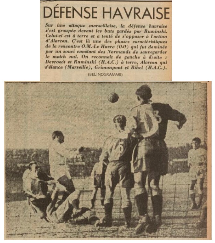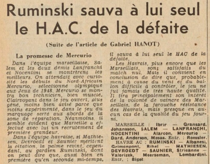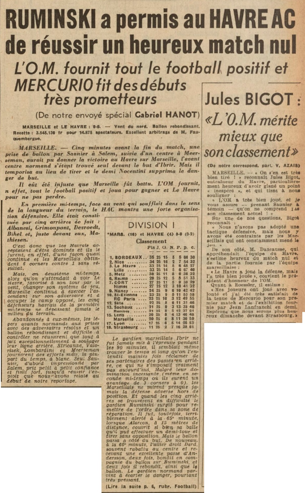 Si ce match Le Havre O.M. ne fut pas un choc à sensation il nous réserva dans les cinq dernières minutes quelques émotions fortes ou tour à tour les deux adversaires faillirent l'emporter sur un exploit personnel. La rencontre fut pourtant de bonne qualité et ne tomba jamais dans l'indifférence, pour la bonne raison qu'avants phocéens et défenseurs havrais mirent à la tâche un coeur énorme et une volonté inébranlable. Quant au scénario, il fut le même d'un bout à l'autre de la partie. Attaque marseillaise accula constamment les Normands sur leurs bois, ceux-ci se défendirent avec vaillance et ne commettant aucune faute renvoyèrent inexorablement toutes les balles ! Dans les bois havrais Ruminski a fourni une partie exemplaire toujours bien placé, parfois servi par la chance, il a fait preuve d'une étourdissante vista ! Grimonpont est également en très grande forme, prompt, rapide, il a annihilé complètement Andersson qui n'a jamais eu la possibilité de shooter en bonne position. Mathiesen, dans la ligne médiane, tint son rôle très honorablement. Il couvrit un terrain énorme et parut infatigable. Bon début de Mercurio Tous les yeux, hier, au stade étaient braqués sur Mercurio. Le jeune de Chiffalo a fourni de très bons débuts. Couvrant bien sa balle, il n'a pas rechigné à la besogne, il s'est montré omniprésent. Il a certainement progressé depuis deux ans quand il aura retrouvé le rythme "pro" il sera un avant des plus précieux. |