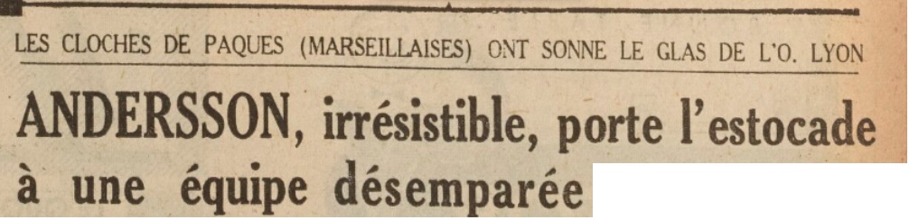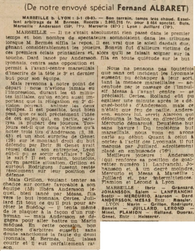ENFIN... ANDERSSON OUVRE LE SCORE On assiste à quelques phases de jeu rehaussant sa qualité, notamment à la 48me minute. Andersson et Mercurio, en passes croisées, sèment le désarroi chez les défenseurs lyonnais. Après deux réactions de la part de Dupraz et de Genet, l'O.M. augmente sa pression. Corner (encore) en sa faveur, tir de Scotti de peu au-dessus. Lyon paraît accusé la fatigue et la... chaleur. Et c'est ainsi qu'à la 58me minute Mesas, se fait remarquer par son activité - débordante parfois mais productives tout de même - sert Andersson en position d'ailier gauche. Malgré une "ceinture" de Julliard le meilleur joueur sur la pelouse inscrit le premier but de la partie par un shoot sec et précis. O.M. 1 - Lyon 0. Ça respire dans les tribunes. Pas très longtemps car sur la phase de la remise en jeu Lyon et bien près d'égaliser. ANDERSSON PLUS A L'AISE A... L'AILE Les actions de l'O.M. sont plus particulièrement orientées vers l'aile gauche ou Andersson évolue avec plus d'aisance et de faciliter. Il décroche un tir... du tonnerre dans l'extérieur des filets. L'O.M. obtient son septième corner. C'est au tour de Dard. Le 2me but "chauffe". C'est Mercurio qui va le réaliser à la 66me minute. Servi par Alarcon, le petit intérieur se libère de son adversaire direct par un demi tour, décoche à sentir, Morin, surpris, est battu. O.M. 2 - Lyon 0. TETE D'ANDERSSON ET BUT Cette absence de l'arrière Lyonnais va se révéler désastreuse pour son club. En effet, Dard libéré de toute emprise, ajuste un centre. Andersson réceptionne de la tête et marque le 3me but marseillais, marge suffisante pour assurer -enfin- un succès olympien. O.M. 3 - Lyon 0. Il le fallait, car cinq minutes plus tard, sur un tir placé mais peu Violent, Juillard des 20 mètres, bat Ibrir dont le "plongeon" manquait de... souplesse et de netteté. Lyon ne réagira plus que faiblement. Plusieurs joueurs disparaissent totalement notamment Flamion, terne jusqu'à la ; Rodriguez, exilé à l'aile. C'est encore Andersson qui sera l'auteur du dernier exploit de la rencontre. À 7 minutes de la fin, il expédiera un de ses shoots dont il a le secret, contraignant Morin a un arrêt splendide. ANDERSSON de loin JOHANSSON PUIS ALARCON, MERCURIO, MESAS Il est particulièrement difficile de louanger l'équipe marseillaise après sa victoire sur Lyon. Certes les "vaut" deux points, mais le spectacle offert était de qualité très faible. Tout juste si l'on peut citer 15 minutes et sept ou huit phases. C'est bien peu pour un club d'un tel renom. Il faut sortir Andersson qui, non content de faire étalage de sa très grande classe, sait lutter et se comporte en vrai "gentleman". Un grand coup de chapeau à ce grand "monsieur du football". Après lui on peut accorder une mention à Johansson, dont le placement et la précision permet une assise plus stable de la défense. Alarcon s'efforça -parfois avec bonheur- de construire et de percer. Supérieur par son jeu de tête. On peut citer également Lanfranchi pour son travail obscur et soutenu, Mercurio, malgré quelque passage "à vide". Mesas dérouta Rodriguez par sa "manière". Il fut peut-être à l'origine de la désagrégation et la défense lyonnaise et participa grandement au succès marseillais. Dard n'est plus le fougueux ailier que nous avons connu, et les réflexes sont émoussés. Il a lutté et c'est déjà bien. Gransart, Salem et Scotti - économie ou manque de condition - s'ils ne ressortirent pas ne commirent pas d'erreur grossière. Quant à Ibrir, il eut deux "sorties" bien inspirée, et parut manquer de détente sur le shoot qui fit but. A. AULAGNIER |