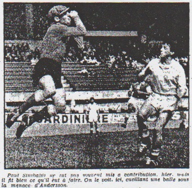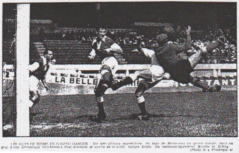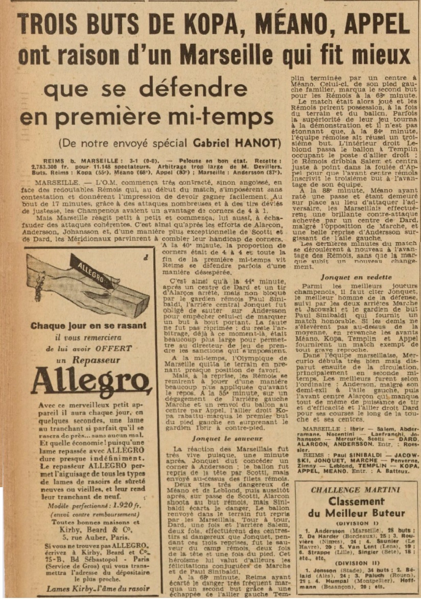 Le match O.M. - Reims s'est disputé sous un soleil radieux et lorsque l'arbitre M. Devillers appelle les deux équipes qui s'alignent dans les formations annoncées, 10.000 spectateurs environ garnissent les tribunes et gradins. À la 5', Meano, très vif, adresse un violent tir sur la barre : Ibrir a eu chaud ! A la 11', Appel met en danger Ibrir : celui-ci dégage au pied. À la minute suivante, Alarcon descend tout seul, mais son tir et mal dirigé. À la 33e Sinibaldi plonge dans les pieds d'Alarcon. L'O.M. obtient successivement deux corners sans résultat. À la 40', Andersson tire un quatrième corner. Sinibaldi saute, lâche la balle, Scotti la reprend mais rate la cage. Et la mi-temps survient après que Reims ait bénéficié de deux nouveaux corners (41' et 42') et qu'Alarcon en est obligé le keeper rémois à lui plonger encore dans les pieds. Dès la reprise, alerte sur le camp champenois. Scotti descend avec décision, Sinibaldi sort et repousse. À la 55', appelle fausse compagnie à Abder, il dévie le cuir sur Kopa, qui, en position d'inter, tire dans sa foulée : Ibrir plonge mais manque la balle. Reims : 1 - O.M. : 0 Meano (61'), Leblond (62'), Alarcon (63') tentent leur chance. À la 65', Dard tire en force : Jonquet, sur la ligne sauve son camp. À la 69' Templin file le long de la touche, Salem ne peut le rattraper ; le Rémois passe la balle à Meano, qui complètement démarqué, n'a aucune peine à ajuster son shoot et à battre de nouveau Ibrir. Reims : 2 - O.M. : 0 A la 84', Kopa échappe à Salem, qui s'était porté à sa rencontre ; il adresse une excellente balle à Appel qui reprend instantanément et score. Reims : 3 - O.M. : 0 A la 88', Dard surprend Marche, monte à l'assaut des bois rémois : il centre devant la cage, Andersson reprend de volée et sauve l'honneur marseillais. Reims : 3 - O.M. : 1. |
