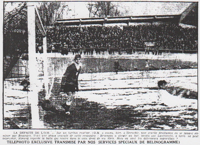 GRENOBLE. - Il faisait froid au stade municipal de Grenoble, lorsque Skyba mit en jeu, et la pelouse enneigée, au traçage très net, laissait espérer qu'elle ne deviendrait pas un bourbier trop gluant, parce que la couche immaculée qu'il recouvrait n'était pas des plus épaisses. Les équipes s'alignaient comme indiqué par ailleurs, sous les ordres de M. Bermes. Deux minutes ne s'étaient pas écoulées que sur un long tir plongeant d'Hoffmann, Morand bloquait calmement et inspirait à son équipe une confiance que sa qualité de remplaçant pouvait permettre de discuter. La réplique ne se faisait pas attendre, et Andersson, puis Mesas, trouvaient Angel sur le chemin, un chemin que le goal bisontin n'hésitait pas à barrer de son propre corps sur la deuxième poussée offensive. Au 10me et 18me minutes l'O.M. obtenait ces deux premiers corner, mais Dard ne sut pas en tirer profit. Sur le troisième coup de pied de coin que Mesas obtint à la 20me minute, Dard tira sur Alarcon et Angel repoussa du poing, comme il avait aussi détourné en corner (le quatrième), un nouveau shoot d'Alarcon. En 25 minutes, l'O.M. avait démontré une incontestable supériorité territoriale, que la présence d'esprit ou, si l'on préfère, les prompts réflexes du portier doubiste, avaient réduit à néant. La défense olympienne Comme il arrive souvent en pareil cas, l'attaque bizontine repris du poil de la bête, et la défense olympienne dut faire face la demi-heure franchie, à quelques offensives du quintette emmené par Skyba, et animé par Hoffmann. Besançon ouvre le score... À la 43me minute, Salem concède un corner que Jacques tirait sur le paquet de joueurs massés devant Morand, Ross héritait du cuir et ouvrait le score. ... et l'O.M. égalise Le temps de remettre en jeu et après un premier 6 mètres, le cuir courrait de Lanfranchi à Andersson, à Alarcon, encore à Andersson, et le Suédois égalisait une minute après l'exploit de Ross. L'O.M. venait de rétablir une situation que l'on croyait compromise après les exploits d'Angel et de refaire le terrain perdu, alors que Besançon pensait avoir retourné la face du match. À la mi-temps, le score était donc de 1 but à 1. Frissons pour l'O.M. Dès la remise en jeu, sur demi-loupé de Gransart, Ross, l'ailier droit bisontin, envoya le ballon dans le décor des Alpes dauphinoises qui surplombent le stade. Au quart d'heure de reprise, Besançon obtenait son quatrième corner, après qu'Koffman, puis Milani, eussent obligé Morand à bloquer deux tirs lointains, mais appuyés et bien ajustés. |