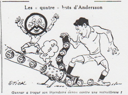 À la reprise, la défense locale retrouva peu à peu son équilibre. Gransart, en définitive, sortit vainqueur de son duel avec Deladerriere assez brouillon, Johansson s'avéra un remarquable briseur d'attaque, la défense de zone fut très efficace. Andersson optimiste en diable ! Au cours du second acte, l'O.M. nous offrit une bien meilleure prestation que durant le premier. Andersson qui marqua quatre buts fut naturellement le héros de la rencontre. Opportuniste en diable, il ratissa toutes les balles à la portée et ne laissa aucun répit à l'arrière-garde de Braun. Mindonnet, après avoir tenu en respect le "loup-garou" suédois baissa de pied et fut finalement submergé. Une fois de Clément, un mauvais blocage de Brun permirent à Gunnar de se tailler un triomphal succès. Le changement Lanfranchi - Scotti fut efficient, le capitaine olympien fut très à l'aise dans son rôle de pourvoyeur, Mercurio fut le seul en dehors du centre avant à tenter sa chance, son action dans l'ensemble fut très utile. Dard n'est pas paru complètement remis de son claquage. Tous les joueurs marseillais ont joué avec un coeur admirable mais le rendement productif repose trop sur deux épaules : celle d'Andersson Alain DELCROIX |