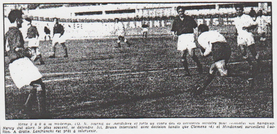 Le match O.M. Nancy des buts devant une bonne assistance que l'on peut évaluer à 12.000 spectateurs environ. Les équipes s'alignent dans les formations annoncées. Dès la 1re minute, Mercurio tire sur Braun qui bloque avec maestria, une minute plus tard, Bottollier s'échappe et botte sur le montant droit des bois de Poncet. À la 9me minute, stupeur dans le stade ! Andersson s'écroulent mais il reprend immédiatement sa place, à la 20me minute Mercurio se distingue par un excellant ras de terre qui manque la cage. À la 22me minute, Scotti et Salem hésitent, Daniel en profite, il s'échappe après avoir reçu le cuir et Piantoni et dans sa foulée, shoote dans le coin gauche. Nancy 1 - O.M. 0 A la 32me minute, un heading d'Andersson est trop haut, le même joueur expédie un bolide sur Braun. À la 38e minute, Piantoni est touché dans un choc avec Scotti ; deux minutes avant la mi-temps, Nunge fonce, il donne la sphère à Piantoni qui de 35 mètres ajuste magnifiquement son tir. Nancy 2 - O.M. 0 A la reprise, l'Olympique paraît plus alerte, plus dangereux et à 46e minute, Lanfranchi sert Andersson, Braun sort pour dégager au pied, il gêne le Suédois dans son action, mais celui-ci peut néanmoins ajuster son essai et la balle roule doucement dans les bois vides. Nancy 2 - O.M. 1 Andersson se met en relief à deux reprises mais ses shoots sont mal ajustés. |
