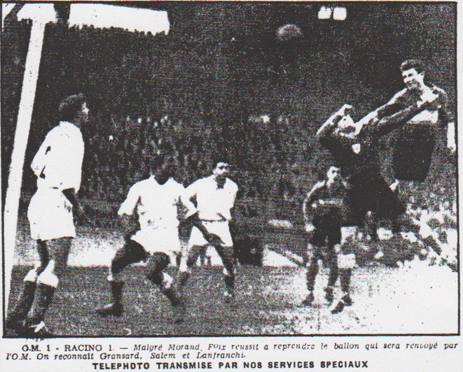L'O.M. en péril Encore des instants très pénibles pour la défense olympienne, et nouvelle échappée de Dard, cette fois-ci. Il tire posément, trop même, car la balle passe à cinq centimètres de la cage. Sur erreur de Nocentini, Schaap shoote, mais Morand arrête au prix d'une très belle détente. Enfin, à la 44me minute, l'inévitable se produit : un rebond sert Cisowski dont le shoot obtient l'égalisation. La mi-temps survient après une furieuse mêlée sur les buts de Morand. Seconde mi-temps A la reprise, le Racing reprend sa pression. Une décision précipitée de l'arbitre prive Rustichelli du bénéfice d'un bel effort. Mais "le môme" ne tarde pas à prendre une brillante revanche et Machet somment à grand-peine. Foix s'échappe et tire sur Morand : politesse rendue, Andersson met une balle très dure sur le ventre de Machet. Une erreur énorme de Nocentini donne une balle "toute cuite" à Cisowski : Morand arrête miraculeusement, et récidive sur corner. L'O.M. est toujours malmené mais ses contre-attaques, dans le style olympien "retrouvé", restent un danger permanent pour Machet. Morand excellent Morand fait une partie splendide et arrête des shoots très durs. Mais il faut dire que ses arrières Salem surtout, font bonne garde et déblaient sans arrêts. Nocentini qui a la redoutable charge de marquer Amalfi, arrive à s'en tirer. La pression du Racing se relâche et l'O.M. reprend du poil de la bête. Une rapide contre-attaque du trio de pointe et Machet sauve péniblement. Sur échappée d'Andersson, il dévie de justesse sur la barre. La fatigue jouera-t-elle ? Beaucoup plus frais, le Racing tente d'avoir l'O.M. à la fatigue, et procède par grands déplacements. Un juge de touche s'en mêle en sifflant contre l'O.M., sous les protestations du public, des hors-jeu imaginaires. Toutefois, sur jolie attaque de Mercurio et Lanfranchi, Dard voit son tir arrêté par Machet. Là-dessus, Cisowski marque mais en télescopant Morand et le but est justement annulé. L'O.M. tient et contre-attaque L'O.M. parviendra-t-il à tenir ? Lanfranchi a sur le soulier la balle du match et la rate. Rustichelli tire ensuite à côté. Mais le Racing revient et les corners se succèdent en sa faveur : s'en est une avalanche, mais Morand pare toujours. Le public réclame un penalty qui, à vrai dire eut été trop sévère. Rustichelli descend et Dard tire à côté. La fin est terriblement émouvante, chaque équipe à sa chance, mais rien ne passe. |