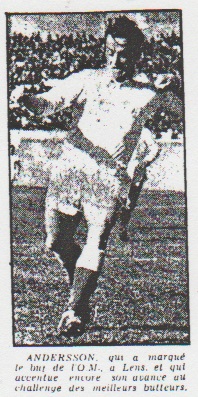 Une 1re combinaison Martins - Ludo, échoua à la 5me minute. Puis - 7me minute - Carre mit au-dessus un magnifique shot qui faisait suite à un intelligent travail combiné de Martins et Severo. Le point culminant de la pression des "gueules noires" se situa à notre sens, à la 19me minute ou coup sur coup, Poncet sauva deux fois en plongeant sur sa gauche et sur sa droite, de très dangereux tir de Martins et Carré. Le réveil olympien Vers la 16e minute, quatrième intervention successive de Duffuler, alerté certes de loin. Sans être poussées, les actions qui avaient motivé le... dérangement du keeper nordistes, démontraient que l'équipe marseillaise se hasardait après avoir "tenu". À la 20me minute, le trio Dard - Andersson - Rustichelli, déséquilibre Marresck et Duffuler fut tout heureux de pouvoir dégager au pied après être sorti de sa surface. Mais de la 25me à la mi-temps, Lens obtint 3 corners et le but chauffa en 2 occasions, notamment à la 37me minute, lorsque après le 1er tir de Carré, renvoyé par un anonyme défenseur marseillais. Stopyra repris un ras de terre dans le coin droit ; mais Nocentini vraiment excellent renvoya une deuxième fois. L'O.M. aussi eut la victoire à sa portée La reprise allait voir un renversement psychologique de la situation. Dès la 46me minute, Andersson avait frisé le but. Il devait le marquer deux minutes plus tard sur centre de Rustichelli et avec la complicité du demi droit Baulard. Pendant un quart d'heure, les blancs allaient vivre dans l'espoir de la victoire et Poncet eut des ailes à la 50me minute pour stopper un centre shot de Stopyra. Sous l'impulsion du vieux renard qu'est Roger Carré, les Lensois refusèrent de s'incliner. À la 55me minute, un 5me corner ne donna rien mais le 6me, obtenu sept minutes plus tard sur le côté gauche, allait permettre à Stopyra d'égaliser à bout portant. La pression locale s'accentua et Poncet fut de nouveaux à l'ouvrage. Il stoppa une tête de Martins puis fut dans l'obligation de plonger dans les pieds du même joueur qui (70me minute) du être emporté du terrain. Si la fin du match fut à l'avantage territorial de Lens, une réaction marseillaise par Rustichelli faillit aboutir mais Andersson (à la dernière seconde) loupa la reprise et le but victorieux. |