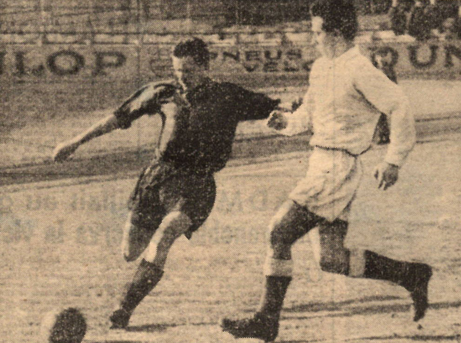 Les Stadistes n'était pas venus à Marseille avec des ambitions démesurées et des les premières minutes de jeu on comprit clairement qu'ils misaient leur chance dans un gentil match nul. Et les hommes de Delfour appliquant de sévères consignes commencèrent à bétonner copieusement dès le premier coup de sifflet de M. Harzig. Vernier et Favre opéraient très repliés et trois hommes demeuraient seuls en pointe. Les Parisiens ayant manifesté clairement leur prudence, qu'ils ne pouvaient faire autrement que de subir la loi de leurs adversaires. Mais ce n'était pas une loi très sévère car les Marseillais se contentant d'une copieuse domination territoriale semblaient se désintéresser au tableau d'affichage ! Ainsi sans s'en rendre compte ils entraient dans le plan de leurs opposants. Certes ils monopolisaient la balle mais les passes étaient mal assurées, tombaient souvent dans les pieds des Parisiens et puis les avants n'avaient pas beaucoup de punch. Colonna, Gaulon gardiens vigilants De plus les quelques rencontres entreprises sérieuses des Phocéens se heurtaient à deux gardiens vigilants Colonna et Gaulon. Le premier doué d'une merveilleuse vista fermait l'angle de tir, se trouvait sur la trajectoire de la balle, il imposa notamment sur un essai dangereux de Lanfranchi à la 4me minute ! Gaulon pour sa part flegmatique et habile "décongestionnait" ses dix-huit mètres, même le jeune Thieffine abattait une besogne inlassable. Il collait véritablement au corps d'Andersson ! |