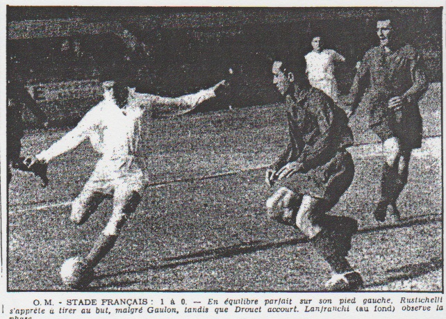 Le stade et l'O.M. ont fait leur apparition à 12h35. Les Parisiens alignèrent : Colonna, Grillon, Drouet ; Brezniak, Thieffine, Gaulon ; Jonsson, Vernier, Vandooren, Favre, Beaucomont. Les Olympiens présentèrent : Ibrir ; Gransart, Salem ; Nocentini, Johansson, Scotti ; Rustichelli, Lanfranchi, Andersson, Mesas, Moreel. À la 22me minute, Lanfranchi dribble les deux arrières Stadistes et décoche un tir puissant que Colonna bloque spectaculairement. Huit minutes s'écoulent et Mesas tente sa chance. À la reprise la pression marseillaise se poursuit. À la 67e minute, Andersson, sur une passe de Scotti, fonce, son bolide s'écrasait sur les filets ; il est fauché par Brezniak et se met à boiter. Rentre une dizaine de minutes plus tard ; c'est alors qu'à la 81me minute, il est lancé par Scotti, il glisse le cuir à Rustichelli ce dernier lui redonne, Andersson crochète Thieffine et de près, bat Colonna. La défaite stadiste est consommée ! |