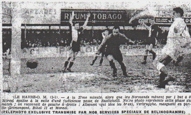 LE HAVRE - La pelouse de la Cavée Verte était grasse, et même plus, lorsque les équipes marseillaise et havraise en prirent possession. Le tracé du terrain était rouge, parce que la neige déblayée en partie n'avait pas voulu complètement vider les lieux et la température était plutôt septentrionale... Le Havre partit littéralement au sprint, et tenta sa chance dès le coup de sifflet initial. L'organisation est telle, à la Cavée Verte, que nous ne pûmes gagner notre place dans la tribune de presse, qu'après avoir échoué aux populaires, et vu Roger Scotti effectué une belle glissade sur le dos. Le Havre été bien mettre des céans. Le Havre marque. On devait donc s'attendre à voir les locaux tirer profit de leur esprit gagneur. Une première fois, Ibrir fut heureux de cueillir un tir de Lombardini, qui avait heurté un montant. Tant que les offensives normandes furent amenées au milieu du terrain, la défense marseillaise sut y faire front. Il fallut un coup franc sifflé contre Gransart, à la 16e minute, pour que Valoryzeck de 22 mètres, battit Ibrir, presque à ras de terre, sur la gauche du portier marseillais. Le Havre avait tenté, et réussi l'effet de surprise. Mais l'O.M. extrêmement volontaire, avait déjà donné un aperçu de ces dispositions offensives. L'O.M. égalise Ce désir de ne pas s'incliner permit à l'O.M. de marquer le plus beau but de la partie. À la 27e minute, la balle partit d'Alarcon vers Dard. Elle revient vers Rustichelli, qui fit semblant de shooter, mais très judicieusement, transmis à Moreel. L'ailier, heureux de l'aubaine ne la laissa pas échappé. Et l'O.M., du coup, compte un but tout comme son volontaire adversaire. La mi-temps allait survenir alors que les coéquipiers de Roger Scotti, tout d'abord submerger, avaient repris du poil de la bête, et s'était permis de traiter d'égal à égal avec un rival qui, pourtant, ne désirait pas (loin de la) s'en laisser compter... Le Havre reprend l'avantage Le score était donc, au repos, à un but partout. Et l'O.M., il faut le dire, avait bien mérité du maillot blanc et des bas bleus. Mais les locaux, désireux d'effacer leur lourd échec de Bordeaux, s'élancèrent dès a reprise. Sur un terrain de plus en plus gras, à force d'être piétiné, ils jouèrent encore une fois leur va-tout, et réussirent à reprendre l'avantage lorsque sonna la 71e minute. |