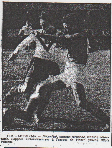 Nous avons parlé du match phare pour qualifier le duel O.M. - Lille. Évidemment, il ne fallait pas être grand clerc pour prédire un triomphal succès à cette opposition. Il fut réussi dans tous les domaines. Et la phrase du président Constant le résume parfaitement : "Un temps splendide a présidé à une rencontre de choix, disputée avec une correction parfaite et dont le résultat nous comble d'aise !" Nordistes et Provençaux avaient des motifs également valables pour faire une cour pressante à dame Victoire. Les premiers désiraient à tout prix assurer leur poste de Dauphins tandis que les seconds voulaient demeurer invincibles au stade vélodrome. Le rêve de Roessler a pris corps, celui de Cheuva s'est évanoui. L'O.M. fait valoir ses prétentions Ce match commença sous le "signe de la guerre totale", c'est-à-dire que les deux formations appuyèrent sur le "champignon" à fond. C'était une lutte de vitesse et de lutte à outrance. Qui le premier s'avérerait fourbu ? L'O.M. parut affirmer ses prétentions en ouvrant le score dès la fin du premier quart d'heure grâce à Lanfranchi. Les "Dogues" n'avaient pas encore rentré leurs crocs, mais celui-ci devaient être élimés au fur et à mesure que le match progressé. L'Olympique surtout dans le domaine offensif, a été plus rapide que son adversaire. Ses avants ont couru et ont fait courir la balle ! Strappe tout seul ! Le poteau suppléa souvent les keepers. Strappe en fil expérience pour Lille, Rusticchelli, Nocentini pour l'O.M. Pour en revenir à l'inter nordiste, soulignons qu'il fut isolé, abandonné, livré à ses propres moyens au milieu d'une attaque stérile, craignant de prendre ses responsabilités et perdants des secondes précieuses dans la surface de réparation ennemie. |