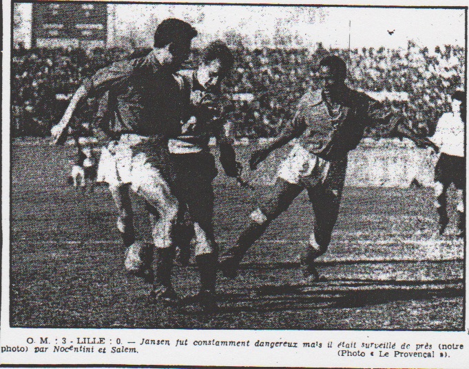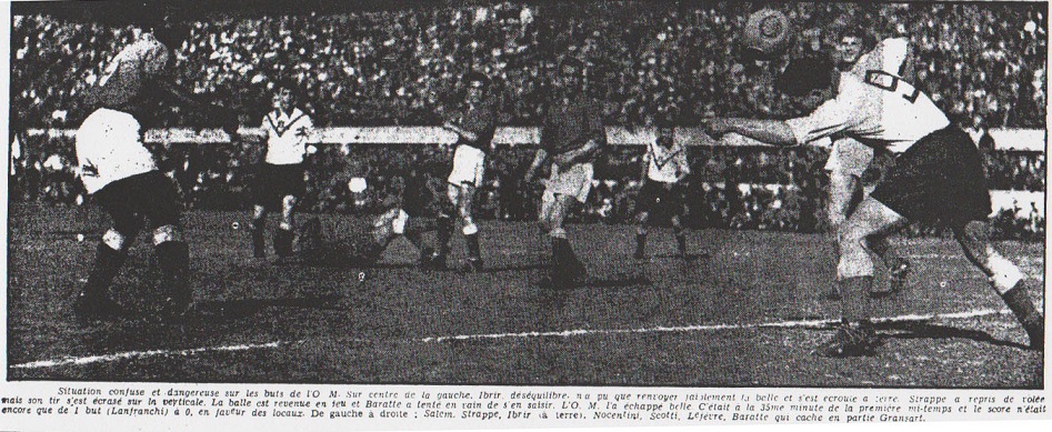 Le match O.M. -Lille débute dans un stade comble et sous un chaud soleil printanier. Les Marseillais jouent en bleu et dès le début sont en action. Une jolie combinaison Scotti, Moreel se termine par un tir "nuageux" d'Andersson. À la 12', à la suite d'un coup franc botté par Dubreucq, Ibrir renvoie mal le ballon ; celle-ci est reprise par Strappe donc le shoot s'écrasé sur le poteau droit. Une minute s'écoule et l'O.M., attaque encore. Scotti glisse le cuir à Andersson, le Suédois le passe à Dard qui échappe à Vuye et centre au cordeau. Lanfranchi reprend magnifiquement et fusille Ruminski à cinq mètres environ ! O.M. : 1 - Lille : 0 A la 19' le score manque d'un cheveu d'être aggravé, le tir de Rustichelli et rencontre le poteau droit ! Van der Hart, sauve ensuite in extremis son camp, sur un assaut d'Andersson. À la 31' Nocentini botte à son tour sur la balle dans l'angle droit ! |
