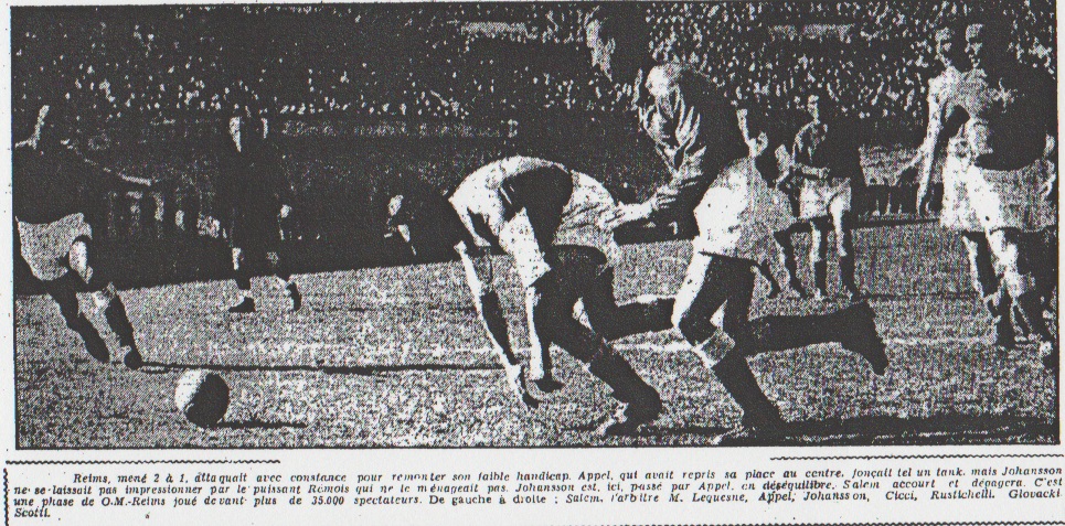 Les deux équipes se présentent dans les formations annoncées. Une heure avant le coup d'envoi, le stade est déjà comble ! Dès la première seconde, l'olympique attaque avec promptitude. Moreel, Rustichelli, Nocentini tirent à côté de la cage de Paul Sinibaldi À la 10me minute, Moreel passe la balle à Nocentini qui fait semblant de shooter. Le cuir est repris par Dard qui le loge dans les filets. Le public applaudit avec enthousiasme. Trois minutes plus tard, Rustichelli file avec décision vers les bois rémois ; il donne la balle à Dard. Paul Sinibaldi dégage, Nocentini bloque la sphère et d'un tir violent marque de demi-volée dans le coin droit. O.M. : 2 ; Reims : 0. On note ensuite un tir d'Andersson dans les nuages et le combat change d'âme. Une attaque pressante de Meano oblige Johansson a concédé un corner. Et en trois minutes le team de Batteux à cinq coups de pied de coin à son avantage, mais il n'en profite d'aucun ! Un sixième est obtenu par un shoot dure de Meano sur Poncet. La cadence a baissé, Reims a la conduite des opérations, mais sans furia. Une tête de Meano (33me minute), un bolide imprécis d'Appel, un shoot trop haut de Glowaski et la mi-temps survient sans doute nul changement au tableau d'affichage. |