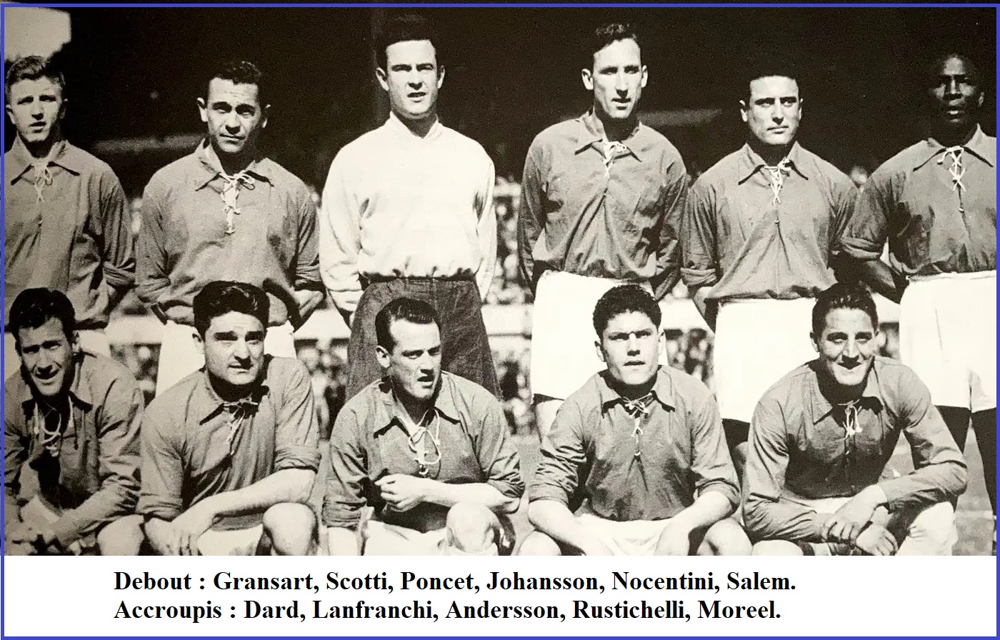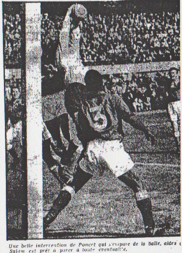 Poncet a réussi de brillantes interventions en particulier sur le dernier essai de Meano. Gransart a été solide devant Meano. Salem fut le plus en verve des défenseurs. Sa diabolique activité a écoeuré Appel. Nocentini fut inlassable, surtout dans le domaine offensif. Johansson moins sur que devant Lille, il a contenu Kopa. Scotti sans être étincelant a stoppé Glowalski. Dard eut des percées inquiétantes pour Pi Sinibaldi. Lanfranchi abattit une rude besogne en défense. Andersson a combattu mais il avait un garde du corps intraitable. Rustichelli a essayé de construire mais ce n'est pas un inter. Moreel n'a pas paru au mieux de sa condition. Paul Sinibaldi n'a pas été très heureux sur le premier but, Marche déblaya avec énergie. Zimny fut très hargneux devant Dard. Cicci ne fut pas transcendant ; Jonquet a réalisé l'une de ses meilleures parties ; Penverne a travaillé ; Appel fut le plus incisif de l'attaque ; Glowalski a été moyen ; Kopa fut ardent et dangereux ; Pierre Sinibaldi fut un peu lent ; enfin Meano a réussi des shots redoutables. |
