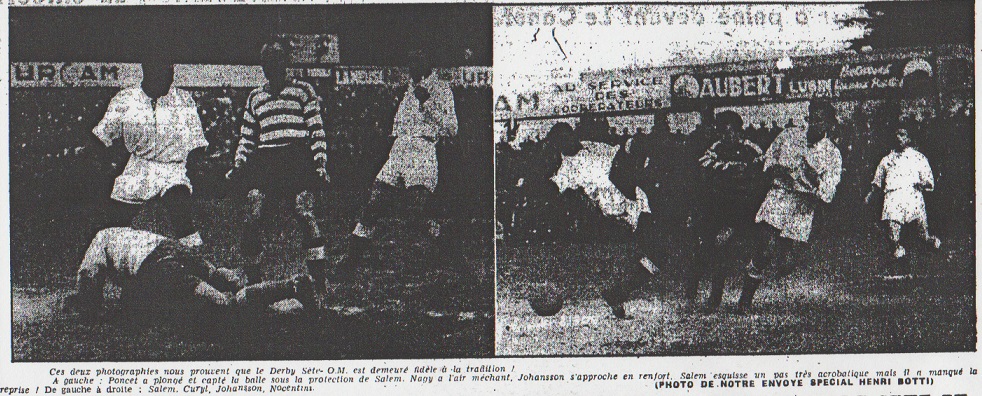 Plus classique derby F.C. Sète - Olympique de Marseille n'a pas attiré la grande foule au stade des Métairies. L'O.M. présente la formation annoncée. À Sète, Mioubi est finalement absent et Laborde disparaît de la ligne médiane. Sète présente : Pons ; Rznko, Mamberta ; Martin, Griffiths, Arribi ; Nagy, Antonio, Duluc, Fontaine, Curyl. Dès les premières secondes on comprend que les deux formations ne se feront aucun cadeau. Sète attaque et obtient un premier corner et à la 3e minute Poncet dégage ; c'est Arribi qui prend le cuir, aucun adversaire ne s'oppose à sa percée, il donne la balle dans le trou, la défense olympienne cafouille, Poncet et Salem sortent, le Marocain dégage faiblement, Duluc surgit en trombe pour s'emparer du cuir et expédier un boulet que Poncet ne peut arrêter. Sète : 1 - O.M. : 0 Quatre minute plus tard, Mesas fonçe avec décision, et tire dans sa foulée, mais à côté. À la 21e minute, sur un coup franc de Mamberta, Poncet repousse de façon excellente. Curyl est knock-out. Il va sur la touche. Sète joue à dix, Gransart passe dans l'attaque shoote avec force. Il rate de peu légalisation ! |