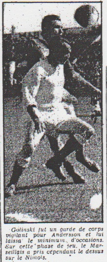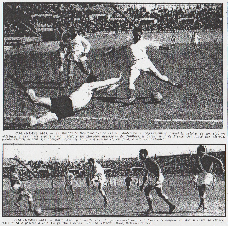 NIMES (handicapé) subit la loi de l'O.M. réaliste et entreprenant Menés au repos (2 à 0) les Gardois donnèrent l'impression de pouvoir égaliser après le but de Carrier, mais... ...Andersson leur porta l'estocade (4-1) |