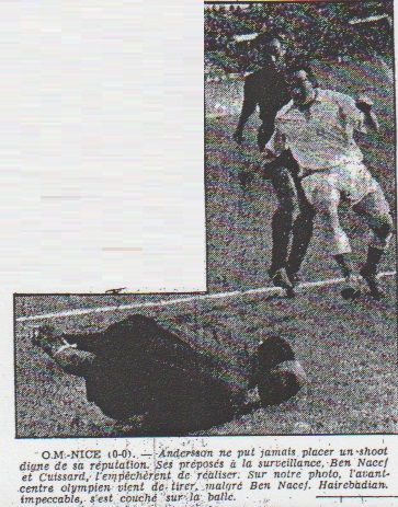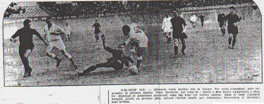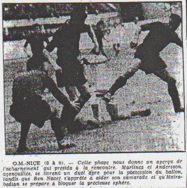 Nice est toujours sur sa ligne des 18 mètres. Andersson, au moment de placer son tir, est pris en sandwich. L'arbitre néanmoins, ne siffle rien, au grand désespoir des olympiens et du public. On s'achemine vers la mi-temps lorsque les Niçois se réveillent. Coup sur coup (43' et 44') Angel intervient dans un style plein d'assurance, sur des boulets de canon d'Ujlaki et de Fontaine. A la mi-temps : 0 à 0 L'heure des Niçois Sans abandonner leur prudence tactique de marquage d'Andersson, les Niçois entament la deuxième mi-temps avec le désir ardent de l'emporter. Cuissard organise son attaque. Il ouvre fréquemment sur ses inters et surtout sur son ailier gauche Nuremberg qui reprend à la 46e minute un centre de Fontaine, à 5 mètres des buts Angel. On croit au but, mais le portier olympien, dans une détente désespérée, met en corner. Cinq minutes plus tard, Fontaine, seul devant Angel, place un tir au-dessus. Les attaques des Aiglons sont plus incisives, plus mordante. Heureusement que Salem, en grande forme, Johansson et Scotti, qui s'est replié, parent avec succès aux rushes niçois. L'O.M. réagit pendant quelques minutes, cinq très exactement, au cours desquelles les défenseurs niçois sont assiégés. Ils s'en tirent bien d'ailleurs, aidés en cela par les olympiens qui s'évertuent avec un rare mérite à vouloir passer par le centre. La leçon de la première mi-temps n'a pas été hélas comprise. Ce feu de paille terminé, les hommes de Berry vont poursuivre leurs offensives jusqu'au coup de sifflet final. Nuremberg, très dangereux maintenant, échappe souvent à Gransart, notamment à la 73e minute, il se rabat et tire violemment en diagonale, cherchant visiblement l'angle des buts. Son shoot passe à ras du poteau extérieur. L'O.M. concède successivement deux corners ; au cours de l'un d'eux, Angel est télescopé sans gravité par Nuremberg. Plus de peur que de mal. Le match nulle flotte dans l'air, lorsque soudain, Belaid "hérite" d'une balle précise d'Ujlaki et tire en force vers Angel, battu. Johansson, ainsi que nous le disions plus haut, intervient miraculeusement et évite la défaite à l'O.M. Peu après, l'arbitre siffle la fin sur le score nul : 0 à 0. Maurice GOIRAND |