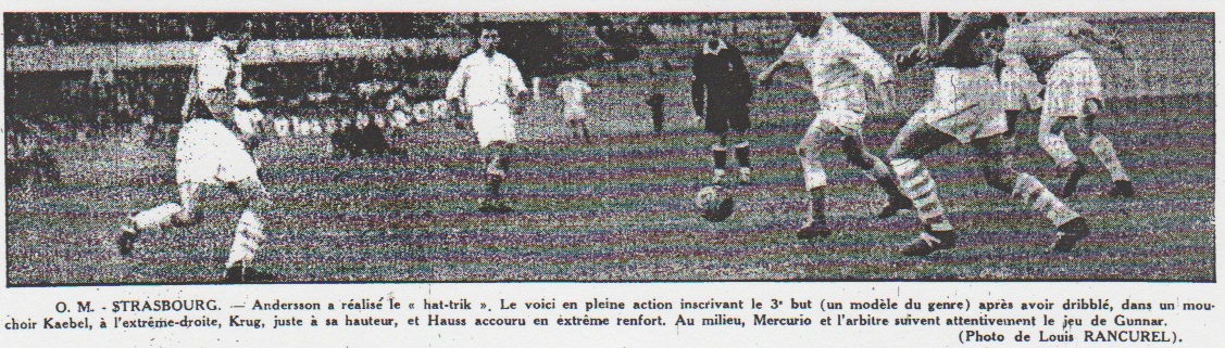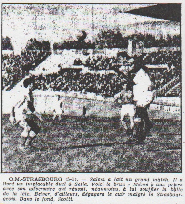 Andersson ouvre le score A la 36me minute, sur une sortie en touche Mesas, Scotti contrôle la balle et ouvre en diagonale vers les buts de Kress. Andersson, placé exactement dans la trajectoire, dévie légèrement et hors de portée du gardien strasbourgeois. C'est le premier but olympien. Johansson blessé légèrement Baillot se fait remarquer par sa virilité et Johansson en supporte les conséquences sans gravité d'ailleurs. Strasbourg fait le forcing. Un tir de Sesia (42e) passe à côté de la cage. Mesas tire en force le coup de pied de réparation. La balle pénètre dans l'angle droit des filets olympiens et c'est l'égalisation pour les Alsaciens. Second but d'Andersson On joue les dernières secondes du premier half. Soudain Mercurio part du milieu du terrain prend toute la défense adverse à contre-pied, donne à Andersson qui de 3 mètres fusille Kress d'un ras de terre imparable. L'O.M. donne la leçon Dès la reprise, l'O.M., domine dans tous les compartiments un onze strasbourgeois décidé à limiter le score. Les attaques fusent de toutes part dans un style magnifique. A la 55me minute, Rustichelli, sur le point du corner, transmet à Scotti, Roger sert Andersson. L'avant-centre marseillais dribble, dans un espace restreint, successivement Kaelbel et Krug. Le portier esquisse une légère sortie mais le Suédois ne se laisse pas émouvoir et marque son troisième but successif, un modèle du genre d'ailleurs. Mercurio, puncheur à son tour A peine vient-on de remettre en jeu qu'une combinaison Andersson-Dard donne la balle à Scotti. L'intérieur droit, de la tête, envoie dans l'espace libre. Mercurio est à la réception. Il lobe Kress très adroitement et l'O.M., après cette action, mène par 4 à 1. Vers la fin du match, Mercurio, à nouveau inscrit le cinquième et dernier but, du à une action rapide entre Belver, Scotti et Andersson. Maurice GOIRAND |