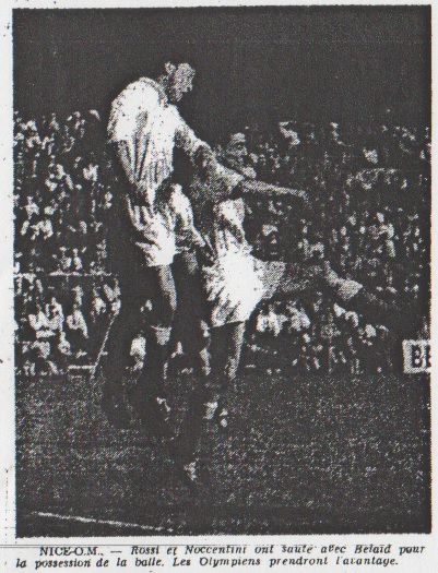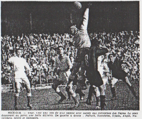 Nice - Avant le début de cette rencontre, on ne donnait pas cher des chances marseillaises. En effet, le duel sudiste se présentait sous de mauvais auspices pour l'équipe phocéenne. Il manquait à celle-ci trois hommes de valeur : Salem, Johansson et Andersson. En principe, c'était un handicap insurmontable. A ces absences il fallait ajouter que le onze de Roessler n'a pas pour habitude d'être transcendant en déplacement et particulièrement à Nice, il a rarement obtenu des résultats brillants. Et sans faire preuve de pessimisme outrancier on ne pouvait, à la grande rigueur, qu'espérer un score honorable pour les blancs et, en mettant les choses au mieux, un match nul. Mais la logique et le sport ne font pas souvent bon ménage. Nous en avons eu la preuve éclatante au stade Léo Lagrange. L'Olympique de Marseille a gagné par quatre à deux et a nettement mérité ce succès qui n'est pas dû, il faut insister sur ce point, à une quelconque complaisance du sort. Nice piétine Les Aiglons avaient pris un départ en trombe avec l'intention évidente de s'offrir un avantage coquet à la marque. Et pendant trente minutes, ils bénéficièrent d'une indiscutable domination territoriale. Mahjoub, Fontaine, Cuissard, Belaid partaient à la conquête des 18 mètres marseillais. Mais leurs tirs étaient ou trop lointains ou mal assurés et les défenseurs phocéens ne s'en laissaient pas conter et attaquer franchement la balle et dégageaient leur camp avec faiblesse. A la 22e minute, nous vécûmes l'un des tournants du match. M. Devillers siffla un penalty extrêmement sévère contre l'olympique. Le match, en principe, semblait joué. Comme les Phocéens, décidés jusqu'alors pourraient-il remonter ce but que n'allaient pas manquer de réussir Nice ? Mais Cuissard, mal inspiré, ne parvint pas à loger la sphère dans les cages d'Angel, qui s'écrasa contre le montant gauche des poteaux. Le destin avait parlé en faveur de l'Olympique et les éléments de celui-ci n'allaient pas l'oublier par la suite. La défense niçoise fut faible. La défense niçoise fut faible et elle paya les conséquences de son marquage fantaisiste. On put le constater quand Scotti, ouvrit le score en faveur de Marseille et quand Mercurio amena le second but en feintant Martinez et Cuissard décontenancés par la rapidité de son action. De plus les demis ailes azuréens furent une tendance trop marquée à pousser à l'attaque. Roger Scotti et Ben Barek furent incontestablement les organisateurs du succès marseillais. Ils conduisirent les débats à leur guise, le premier remplaça Andersson pour l'efficacité. N'est-il pas parvenu à réaliser le "hat strick" ? Quant au second, opérant comme un stratège, il conserva la balle au pied et eut des éclairs de génie qui confondirent leurs adversaires, Nuremberg et Fontaine, leurs vis-à-vis furent bien pâles et de jouèrent qu'un rôle très effacé. |
