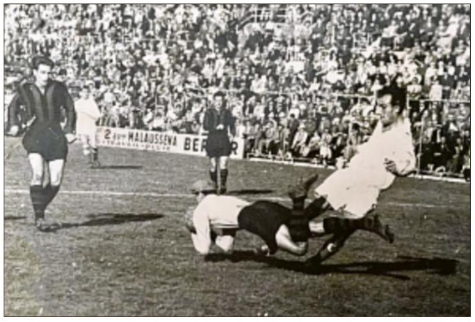 NICE. -Angel n'eut pas beaucoup de travail à accomplir, mais il montra plus d'autorité dans ses interventions et notamment en plongeant dans les pieds de l'avant niçois qui s'avançait seul vers les bois. Gransart fut battu en vitesse par le dangereux Brandahosino. Mais il ne lui laissa pas un moment de liberté est fini par l'écoeuré. Palluch, arrière d'occasion, déblaya avec bonheur son camp et il ne fut pas inquiété par la réputation d'Ujlaki. Nocentini fut plus valeureux en deuxième mi-temps qu'en première. Il stoppa souvent Fontaine, qui fut loin d'être éblouissant. Rossi contint Belaid, il fut excellent dans le domaine défensif. Il brisa plusieurs assauts adverses. Mesas, toujours courageux, se dépensa sans compter. Il relégua Nuremberg a un rôle passif. Il abattit une besogne énorme. Rustichelli fut plus combatif qu'à l'ordinaire en déplacement. Il luttait avec Gonzales et prit quelques fois le meilleur sur lui. Ben Barek ne fut pas ménagé par ses adversaires, mais ne se découragea jamais. Il ne perdit son sang-froid en aucune occasion et marqua un but qui fut un modèle de clarté et de rapidité dans l'intervention. Guidoni eut un début plutôt effacé, ensuite, il essaya de tenter sa chance ; il fut un peu maladroit ; il eut toutefois le mérite de se battre. Poitevin s'en aperçut et fut obligé de le marquer de près. Scotti, auteur d'un "hat trick" s'avéra le champion de l'opportunisme et de l'efficacité. Mercurio donna quelques bonnes balles. Il fut parfois lent mais eut le mérites également de tirer de remarquables corners. À Nice : Hairabedian ne fut pas toujours bien placé sur les shootes marseillais qui le bâtirent. Martinez fut plutôt insuffisant ; il fut responsable en partie du second but. Gonzales n'eût qu'une tenue moyenne. On pouvait s'attendre à mieux de sa part. Cuissard fut très dangereux pendant le premier half puis il baissa son rythme. Poitevin fut obligé, par l'ardeur de Guidoni, de réduire son rôle à la défensive mais il fut très ardent. Mahjoub fut redoutable par ses montées dans la première demi-heure, mais malheureusement, il ne termina pas ses occasions. Ujlaki, toujours dilettante et fantaisiste, de ce racheta qu'en deuxième mi-temps ou de réussi les deux buts niçois. Nuremberg fut ardent, mais son action ne fut pas toujours assez soutenue. Belaid fut dominé par Rossi et rata des occasions magnifiques. Fontaine ne se montra pas à la hauteur de sa réputation et ses tirs furent dépourvus de précision. A.D. |