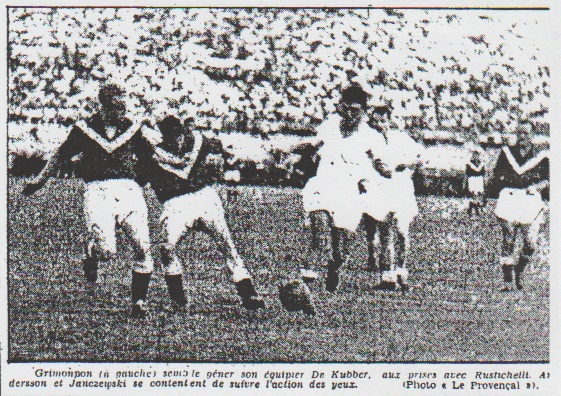 Les Olympiens comme on pouvait le prévoir se sont rachetés. À Lyon, a Nîmes, ils avaient des semelles de plomb et accumulaient comme à plaisir les maladresses. Hier sur la pelouse du stade vélodrome, ils nous ont offert un spectacle beaucoup plus réconfortant. Rapides, décidés, ils ont attaqué franchement la balle et ont shooté avec précision. Aucun élément n'a démérité mais on peut attribuer une mention spéciale à Ben Barek, Andersson et Johansson. Le premier dégagé, désinvolte, s'offrit le luxe de prendre toute la défense à contre-pied et de marquer un but splendide au terme d'une course solitaire. Le citoyen de Montolivet disputa les balles, domina Garriga et signa grâce à sa promptitude le premier point. Enfin l'international scandinave effectua une rentrée sobre, mais efficace. Il mit de l'ordre dans les dix-huit et "contra" le marocain Abdesselem. Angel n'a pas démérité et sortit entre parenthèse avec décision devant Wozniesko en position de tir. |