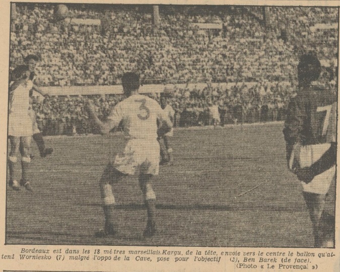 C'est par un temps splendide et alors qu'un certain sens souffle sur le stade, vent qui contrariera les dégagements des goals que la populaire vedette de l'écran Philippe Lemaire, venu en spectateur avec Armand Mestral, donne le coup d'envoi de ce Marseille - Bordeaux. 31.352 spectateurs qui ont payé, apportant au guichet 7.899.700 francs, se demande quel sera le visage de l'O.M. après la défaite de Lyon et le draw de Nîmes. Comme pour répondre à cette question Johansson porte à son actif un premier dégagement effectué avec autant de décision que de netteté. Puis Rustichelli confirme cette première impression favorable aux locaux en approchant dangereusement Bernard. Mais l'ailier pousse trop loin son action et échoue. Visiblement, les Phocéens "en veulent". Si Andersson tire dans les pieds de Janszewski, Ben Barek construit inlassablement. À la sixième minute, le Marocain adresse la balle à Andersson. Bernard tente vainement l'interception, Rustichelli rate sa chance et la balle revient à l'avant-centre suédois qui, malgré Janszewski et Garriga marque dans la cage vide. O.M. : 1 - Bordeaux : 0 C'est du délire. L'euphorie n'est pas encore éteinte que Kargu essaie de tromper Angel, mais en pure perte ; "Pépito" n'est pas celui qui commet des fautes quand l'équipe "tourne". Au contraire, les Marseillais constituent par leur style alerte le bon football qu'ils pratiquent en s'efforçant de maintenir au sol un "cuir" que les Bordelais plus athlétiques s'évertuent de jouer en l'air. C'est ainsi qu'à la douzième minute Bernard est mise dans l'obligation de plonger dans les pieds de Le Gall et Andersson venus des 18 mètres à la suite d'une belle ouverture en profondeur de Vandooren. Les occasions de battre le portier girondin, délaissé par des arrières qui ne se hâtent que lentement, se multiplient : une combinaison Ben Barek - Le Gall - Ben Barek aboutit à Andersson, un Andersson qui "joue" cours, donne des balles, dribble, tente des "heading". Gunnar botte au-dessus. Bordeaux qui devrait changer de vitesse pour s'opposer au bal marseillais, ne peut se reprendre. Ces attaques sont étouffées, et c'est au contraire, l'O.M. qui affirme sa volonté de ne pas rester là. |