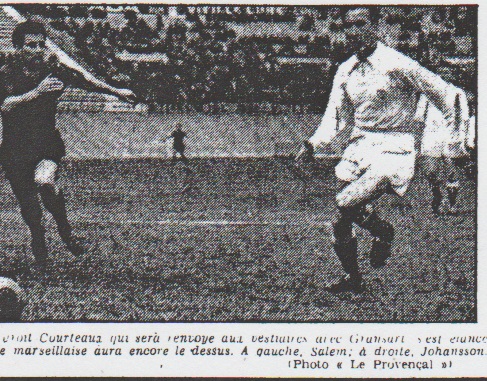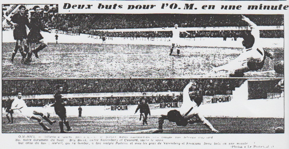 Marseillais continu à assurer le rythme. Une combinaison Marcel - Lle Gall - Andersson se termine même dans les filets adverses, à la 38me minute, mais M. Becret refuse le point pour hors-jeu. Deux buts en une minute En seconde mi-temps, Marcel rate de peu la cage, après avoir échappé à Cuissard... et n'avoir pas vu Andersson bien placé. À la 52me minute, sur une nouvelle attaque phocéenne, le néo Français ratisse, crochète, transmet le cuir à Ben Barek qui botte aussitôt à ras de terre. C'est le but ! Moins d'une minute plus tard, Marcel descend en position déviée gauche, le keeper niçois hésite et ne réagit nullement sur le shoot croisé de l'inter marseillais, lequel inscrit le second but. La victoire olympienne est assurée, mais Nice perd le contrôle de ses nerfs et tandis que Salem fait soigner son arcade sourcilière qui a éclaté à la suite d'un choc, un incident se produit. Courteaux dont les efforts ont été vains depuis le coup d'envoi se distingue en entamant avec Gransart un combat de rue hors programme. C'est pourtant le Marseillais qui sort le premier sur l'intervention du délégué alors que le match est arrêté. Le Niçois rejoindra rapidement l'arrière des blancs aux vestiaires et la rencontre, heurté, se poursuivra. Avant la fin Ujlaki aura l'occasion de sauver l'honneur. Seul il s'approche de Poncet, déclencha un tir splendide. Mais le goal se détend avec à-propos : Marseille a renoué avec la victoire. Georges LEOST |