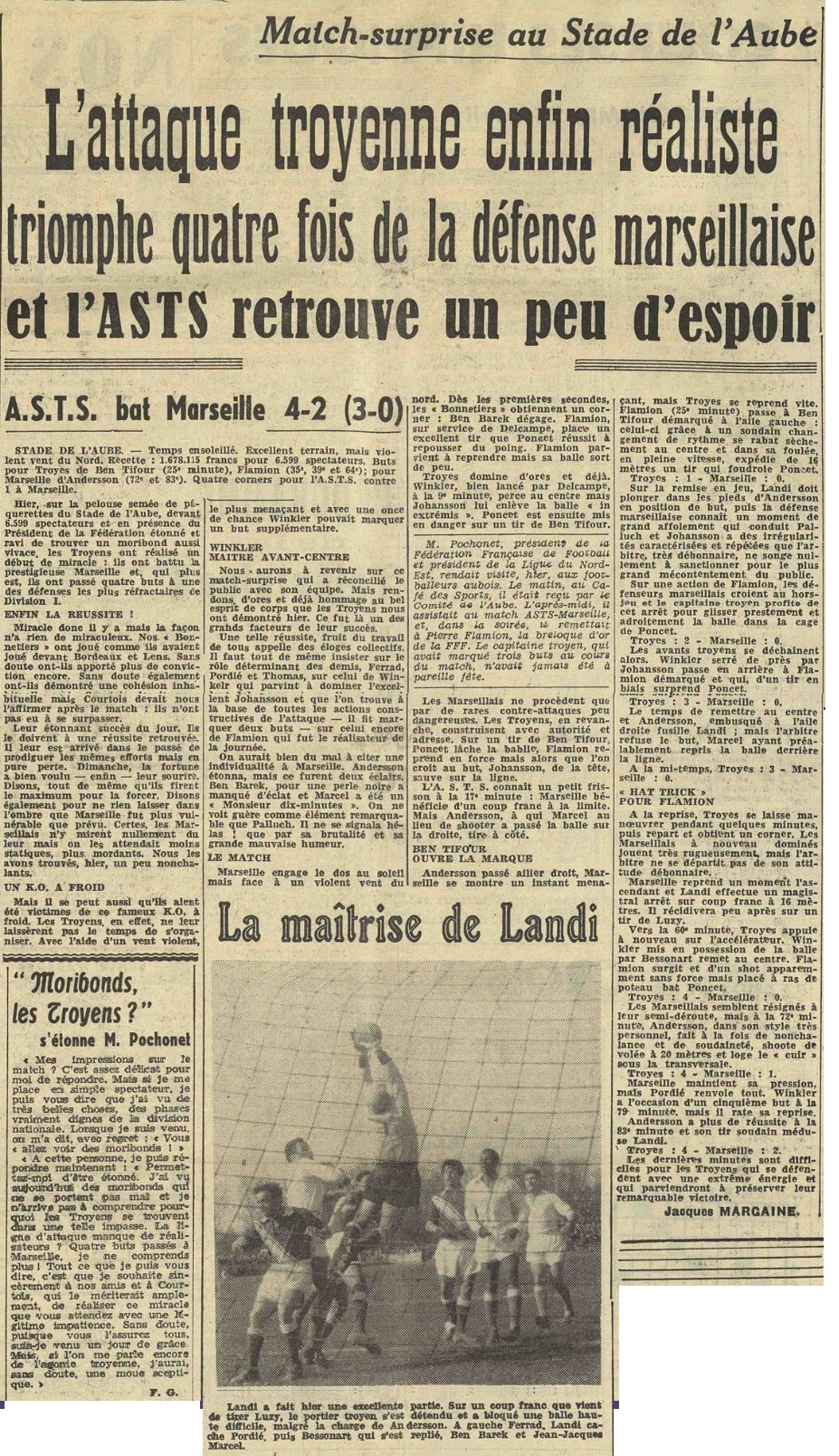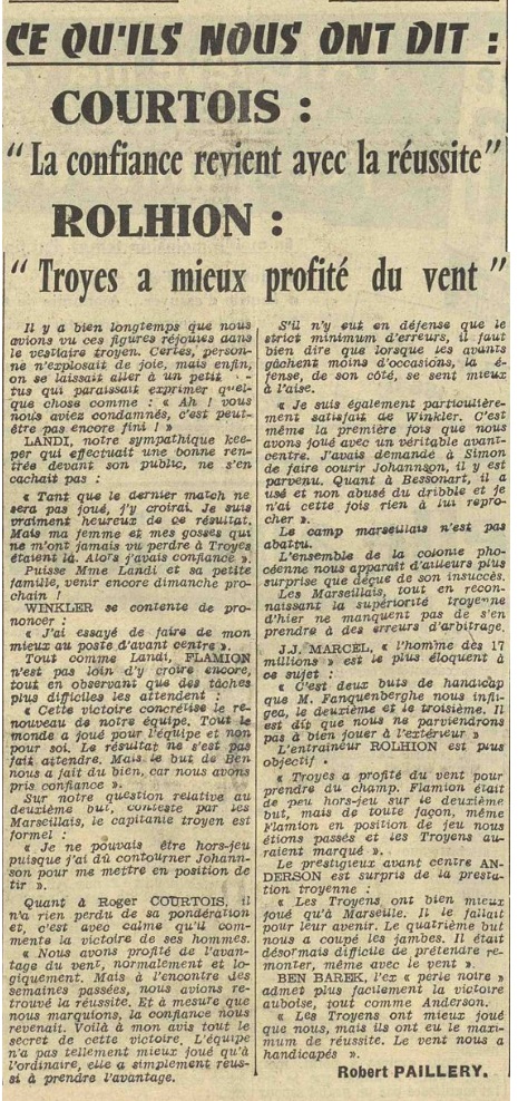 Du côté troyen, la joie règne, comme on s'en doute : Flamion explique le but litigieux, en l'espèce le 3me : "Je ne pouvais pas être hors-jeu, puisque j'ai du, pour marquer contourner Johansson. Nous avons enfin joué en équipe ce qui est un fait nouveau. Il faut convenir que le but de Ben Tifour nous a stimulé". Landi est plus loquace : "Après ce match, tout n'est pas perdu". Courtois l'entraîneur troyen, essaie d'analyser la victoire : "Nous avons su profiter de l'avantage énorme que constituer aujourd'hui le vent. En scorant trois fois en 1re mi-temps nous avons acquis un capital buts qui nous était indispensable. Convenons cependant que nous avons eu aujourd'hui une réussite, qui nous faisait défaut depuis deux mois |