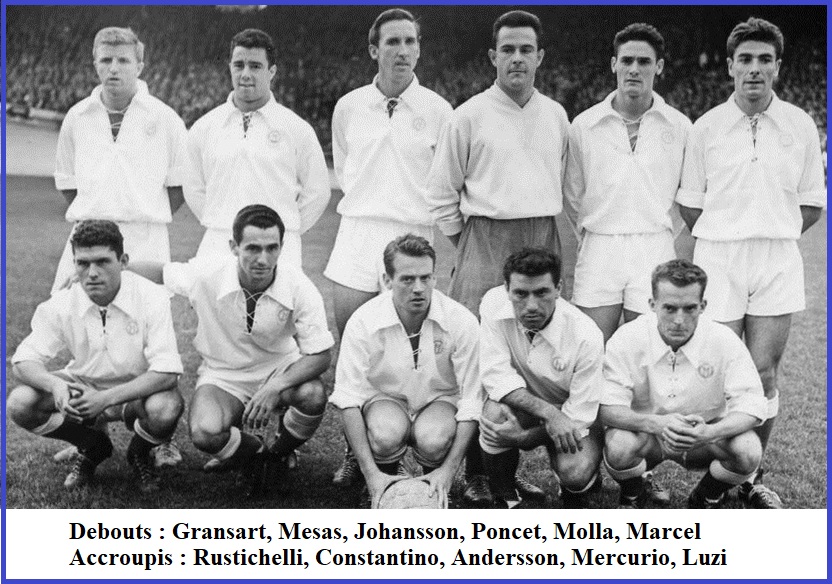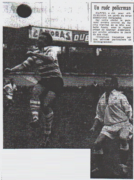 Meilleur élément du onze marseillais en ce sombre dimanche Jean-Jacques Marcel joua avec panache et tenta sans se décourager de renverser une situation compromise par le mauvais début de partie. Ces percées au centre du terrain ou il réussit à passer deux ou trois adversaires, furent spectaculaires. Si elles restèrent inefficaces, c'est que Marcel n'était pas soutenu comme de coutume par son compère Scotti. Le duel entre Andersson et Happel, grande vedette internationale, était la principale attraction de ce Racing - O.M. Il faut reconnaître que cette confrontation, si attendue, tourna à l'avantage de l'Autrichien qui, sans marquer Gunnar de très près, l'empêcha presque toujours, grâce à son immense classe, de se trouver en bonne position de shoot. Andersson lutta avec vaillance. Couvrit bien le ballon et resta la meilleure arme marseillaise. Malheureusement, il manqua de réussite. À l'aile droite, Rustichelli joua lui, un bon début de partie. Il réussit à passer Marche toujours aussi ardent, mais ses centres manquèrent de précision ou ne furent pas repris. L'ailier marseillais ne termina pas aussi bien. Son jeu devint plus brouillon et moins direct au fur et à mesure que son impitoyable adversaire devenait de plus en plus intraitable. À l'aile gauche au contraire, Luzy tint un rôle très effacé en première mi-temps. Il s'améliorera après le repos. Il exploita bien, en particulier, une grosse erreur de Lelong et avait un but tout cuit au bout du pied. Hélas ! Pivois lui plongea dans les jambes et s'agrippa à ses chevilles. |