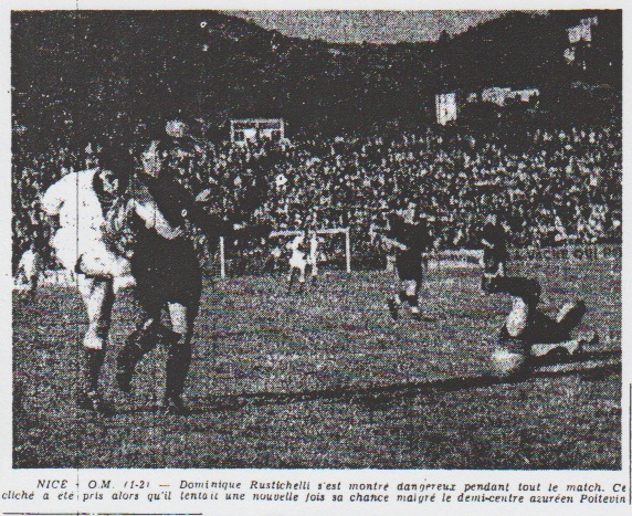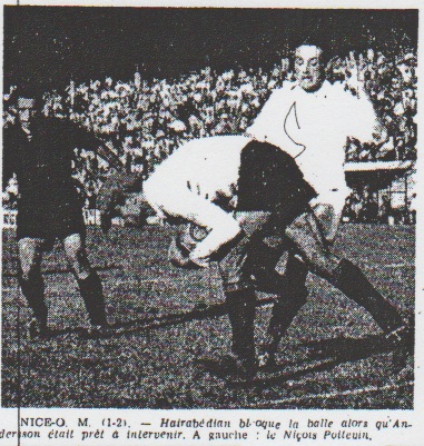 NICE - A la suite d'une phase de jeu qui se termina par un accrochage entre Mesas Rustichelli et le goal niçois et Hairabedian, on vit un homme surgir de la foule et pénétrer en courant sur le terrain. Le quidam voulait dire deux mots à Hairabedian. Bien entendu, avant même d'atteindre le but qu'il s'était fixé, notre homme (un marseillais) fut rapidement ramené à sa place désignée le col légèrement froissé par un gardien de la paix. |