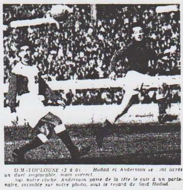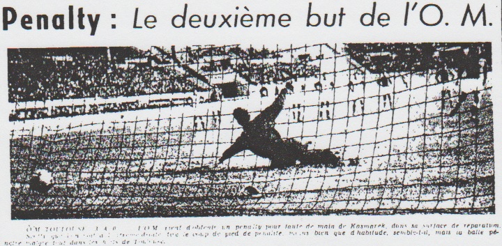 L'O.M., qui jouent en bleu, et Toulouse, s'alignent dans la formation annoncée à l'appel de M. Bondon. Un vent frais et humide balaie le stade, mais la pluie qui s'est arrêtée depuis le matin n'a pas alourdi le ground. Les locaux gagnent le toss et Marcel place ses camarades avec le vent dans le dos. C'est donc Toulouse qui engage et immédiatement Rustichelli déboule irrésistiblement puis Tivoli tire un corner vainement. L'O.M. domine et marque À la 3me minute, Andersson utilisant une longue ouverture de Marcel ajuste son shoot mais rate lamentablement sa chance, la balle sortant du terrain alors qu'elle avait été plus poussée que frappée. Coup sur coup, Tivoli, puis Scotti (2) adresse des corners mais chaque fois la défense de Bigot repousse le danger. Et, après une balle plongeante de Scotti, suivi d'un choc Brodd-Marcel, et d'un tir imprécis de Mercurio, une splendide action Mercurio - Tivoli - Rustichelli met Andersson en possession du ballon. L'avant-centre marseillais place un tir croisé qui trompe Roussel avec une surprenante facilité. O.M. : 1 ; Toulouse : 0. Penalty Roussel se distingue peu après en plongeant devant Andersson, puis Cahuzac tente sa chance et Poncet met en corner. Sur un coup franc donné par Dereuddre, Daniel manque la reprise (17e minute). L'O.M. parvient cependant à desserrer l'étreinte et à la 18me minute, Kasmarek intercepte la sphère de la main dans sa surface, devant Palluch. Un peu sévèrement semble-t-il, M. bondon montre le point de penalty. Scotti, posément, glisse le "cuir" sous Roussel. |