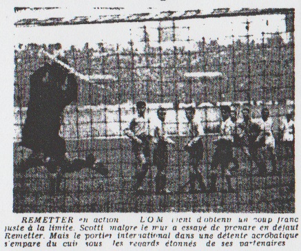 Dès qu'il eut retiré son sweater et ses gants dans les vestiaires le célèbre international, d'une voix sans colère, mais ferme, déclara : "Je suis outré (sic) de l'exhibition de Scotti !" Devant les visages interrogateurs qui se tournèrent alors vers lui après ce préambule, Remetter poursuivit : "Il a, en effet, blessé volontairement Labalette et Bruat. De plus, à plusieurs reprises il m'a retenu par le maillot, ceci pour me faire lâcher la balle. Les procédés ne sont pas dignes d'un joueur. À mon avis SCOTTI N'A PLUS RIEN À FAIRE SUR UN TERRAIN DE FOOTBALL". Nous laissons bien entendu l'entière responsabilité et ces paroles à son auteur. Néanmoins, peut-être ont-elles été prononcées sur un mouvement d'humeur. |