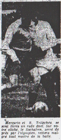 Son pendant, Roger Scotti, ne fut jamais à son affaire et appuya parfois avec excès ses interventions. Il était de plus hier, pris de vitesse et mal inspiré. Au centre, Johansson joua dans un style impérial et se montra le meilleur olympien. Rustichelli nous rappela le Rustichelli de l'an dernier, n'ayant que de très rares éclairs. Constantino se dépensa de son mieux, mais trop lentement, Andersson inquiéta Remetter avec constance. Enfin Mercurio et surtout Chicha peinèrent du début jusqu'à la fin. Dans le camp opposé Remetter fit sensation, bien aidé par Brulat et les remarquables frères Tellechea. |