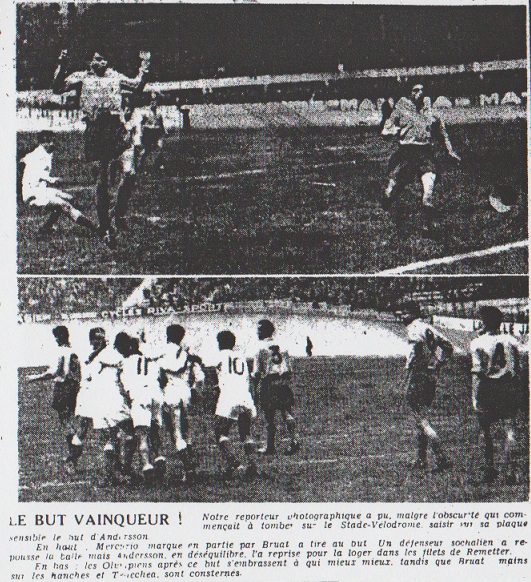 Palluch et Mesas, les deux absents du match O.M. - Sochaux étaient aussi heureux sinon plus que leurs coéquipiers de cette victoire in extremis obtenu sur Sochaux. Le puissant arrière olympien d'ailleurs, ne cessait de répéter : "Nous ne sommes plus qu'à quatre points de Nice. Voilà un classement inattendu... pour certains, mais pas pour moi". Quant à Mesas, il nous disait : "Je préfère être sur le terrain que sur le banc. J'ai trop souffert aujourd'hui et jamais plus je n'assisterai d'aussi près au match de mes camarades". Johansson radieux, on le conçoit, avait, paraît-il prédit le but Andersson à la mi-temps. Mais laissons-lui la parole : "Au repos je me suis approché de Gunnar et je lui ai glissé dans l'oreille : ''il faut que tu marques un but, mais le plus tard possible, car sans cela nous nous risquons de nous faire remonter". Le plus fort, c'est que Andersson a tenu parole... Dorénavant le longiligne suédois usera de sa force de persuasion auprès de celui qui reste le meilleur buteur olympien. |
