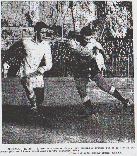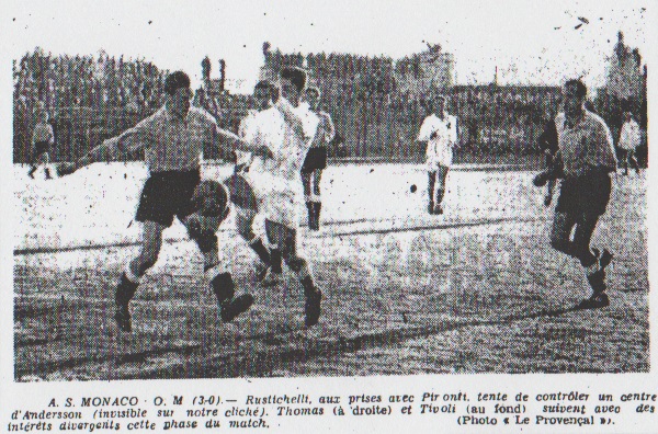 MONACO - Un temps magnifique, qui faisait presque oublier qu'on était au premier jour de l'année 1956, avait incité, bien avant le coup d'envoi, les spectateurs à venir nombreux prendre place autour du rectangle vert du stade Louis II, dans le cadre féerique du champ de jeu encastré au pied du rocher baigné de lumière et rendue plus particulièrement encore par les rugissements des fauves, venus du zoo princier, tout proche. La mer, d'un bleu uniforme, constitue une toile de fond incomparable. Tout est la pour créer la chaude ambiance d'un derby méditerranéen, disputer de surcroît, un jour de fête. Après avoir débité quelques rengaines, les haut-parleurs annoncent la formation des équipes en présence. On apprend ainsi que si Dupal m'a apporté aucun changement à son onze, il n'en est pas de même en ce qui concerne Rolhion. L'entraîneur marseillais, pour faire face à la double défection de Marcel et de Scotti, a appelé Palluch à l'arrière, Molla devenant demi avec Salem et Durand opérant à l'aile gauche. Les supporters phocéens accourus en grand nombre de Marseille applaudissent longuement l'arrivée des "Blancs" sur le ground. Et le match débute. Monaco engage Dès la première minute après une descente repoussée de justesse par la défense marseillaise, Conti oblige Poncet à effectuer son premier arrêt. Puis Valorizek shoote trop haut. Le ballon s'installe dans le temps phocéen et une faute de Gransart permet à Bruay de tenter sa chance. Il le fait trop timidement pour inquiéter sérieusement Poncet. Sur contre-attaque, à la minute 3, Andersson manque de peu de prendre Boukekeur à contre-pied. Mais, tout aussitôt, Johansson dégage une balle lâchée par Poncet. Le jeu se déroule sur un rythme rapide, ponctué par les cris d'une galerie passionnée. À la 8e minute, Rustichelli lance Andersson, qui ne peut que corriger la trajectoire de la balle au passage. L'objectif n'est pas atteint et Boubekeur n'a pas à intervenir. Deux minutes plus tard, à la limite du terrain, l'ex-Suédois adresse un centre sec et précis que le portier local intercepte en plongeant. À la 13e minute, Ben Tifour, en position d'ailier droit, botte sans précision. Puis Durand, Tivoli et Constantino, en se relayant, amènent la balle avec élégance dans les 18 mètres monégasques. Poncet éblouissant A la 15e minute, Bruey, seul, tire puissamment. Poncet se détend magnifiquement, mais sans résultat. Heureusement le ballon s'écrase sur le poteau. À la 16e minute, Valorizek place un shoot terrible que Poncet détourne, auprès d'une parade de très grande classe. Deux fautes de la défense de la principauté devant Rustichelli et Andersson ne donne rien. À la 19e minute, Andersson shoote ; la sphère passe encore à côté. L'allure n'a pas diminué et si Monaco produit le plus beau football, Marseille fournit un match défensif de qualité. Coup franc de Constantino A la 25e minute, une faute de Zitouni sur Tivoli donne lieu à un coup franc que Constantino tire bien sur Rustichelli. Cette pénalité amène le premier corner de la partie, shooté en vain par Rustichelli. À la 28e minute, alors que Rustichelli et Durand ont permuté, Tivoli catapulte le cuir en direction de la cage adverse. Celui-ci est raté de fort peu. L'O.M. domine à son tour et c'est maintenant Monaco qui est acculé en défense. |