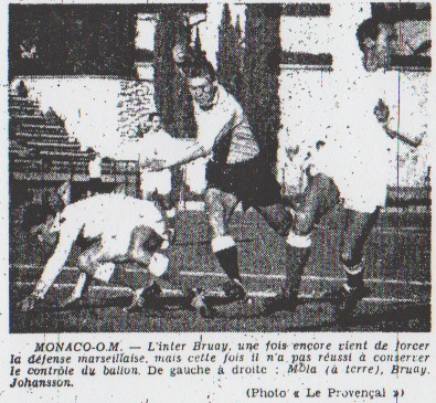 Nous avons dit que les olympiens ne déméritèrent pas jusqu'à la 56e minute du match est mis l'accent sur le fait que le team présenté au stade Louis II était amputé de ses deux meilleurs éléments de ces derniers dimanches : Jean-Jacques Marcel et Scotti. Ceci posé et en en tenant compte, nous passerons en revue une équipe qui lutta longtemps avec courage puis subit son sort, ce qui est assez humain. Poncet fut pris quelque peu en faute sur le premier but et n'a absolument rien à se reprocher sur ceux qui suivirent. Comme par ailleurs le grande "James" sauva plusieurs situations extrêmement périlleuses pour les siens, nous le citerons parmi les meilleurs provençaux pour le réflexe, la détente et l'adresse tant il fit preuve en ces circonstances. Devant lui Gransart débuta assez difficilement, d'autant que Ben Tifour couvrant beaucoup de terrain avait tendance à l'attirer assez loin de ses bases. Le blond Maurice se reprit ensuite puis tomba sous les coups de la loi commune. Palluch, sans ressortir comme à l'accoutumée, travailla avec énergie qui est une de ses qualités magnifiques maîtresses, puis son passage à l'aile n'amena rien de concret. Johansson abattit un gros travail avant de baisser de pied comme tous ses camarades et mis de l'ordre dans la maison, et Dieu sait si elle en avait besoin. |