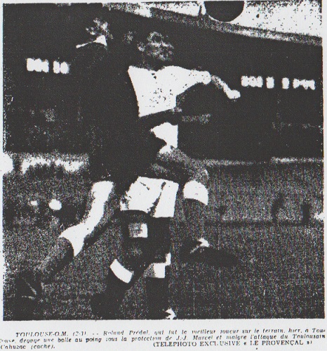 TOULOUSE - "Vous verrez ! on aime bien l'O.M., ici, il y aura du monde au stade municipal !" nous disait le chauffeur de taxi toulousain qui nous conduisait vers le stadium. Malgré cette prophétie toute gratuite, la foule des grands jours n'a pas pris place autour du rectangle superbe de la Cité des Violettes quand les équipes pénètrent sur le ground inondé de soleil. Les deux formations ont été remaniées quelque peu. À l'O.M. Scotti et Constantino ont permuté, le premier jour à droite. À Toulouse, Saunier opère sous le maillot portant le n.9 et Bouchouk sous le n.11. Deux buts en deux minutes C'est Toulouse qui engage, et le ballon voyage d'un camp à l'autre, les vingt deux joueurs semblant hésiter à se livrer totalement par prudence. On note pourtant, au cours de ses premières minutes, un corner concédé par Predal, en difficulté devant Dereuddre (2me minute), un essai raté de Chicha sollicité en retrait par Andersson (3me minute), deux vaines tentatives de Rythonen (5me et 6me minute), le second sur erreur de Molla. À la 8me minute, Bouchouk bat Predal, mais M. Bureloux avait sifflet hors-jeu avant le déclenchement de son tir. Le jeu est équilibré et le public attend impatiemment l'action d'éclat qui le fera vibrer. À la 12me minute, Chicha balle au pied, semble indécis. Des 20 mètres, il place pourtant un tir qui prend la direction du haut du cadre toulousain. Roussel plonge, paraît devoir arrêter la balle, n'y parvient pas et c'est le premier but olympien. Deux minutes plus tard, Rustichelli, de son poste d'ailier droit, se monte plus prompt que son garde du corps Kacsmarek, s'empare du ballon, place un double démarrage et se présente seul devant Roussel. L'attire et projette le cuir dans la cage vide. Les Marseillais exultent. Sportivement, le public applaudit. À la 15me minute, pourtant, Bouchouk, si l'on peut dire, est à deux doigts de réduire la marque. Predal ne se laisse pas surprendre par le heading de l'ailier gauche et la foule reste sur sa faim. Toulouse tente de changer de rythme et Bouchouk, à trois reprises, se distingue alors que qu'à la 28me minute les visiteurs amorcent une très belle attaque par Durand, Andersson et Rustichelli. Roussel sauvant du pied en tombant. Rythonen shoote sur le poteau A partir de la 30me minute, les Phocéens doivent accepter la domination de Toulouse. C'est ainsi qu'à la 37me minute Rythonen place un tir terrible qui rencontre le montant de Predal, lequel paraissait battu. |