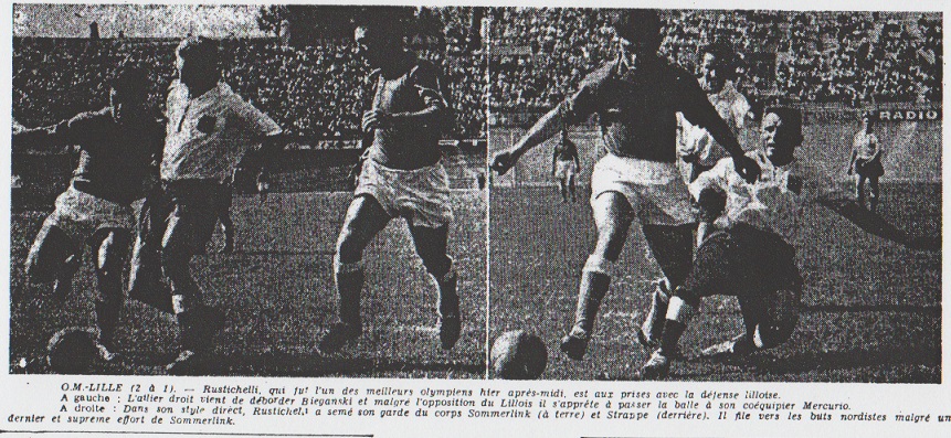 C'est à l'issue d'un match qui resta indécis jusqu'au coup de sifflet final de M. Miel qui le Lille O.S.C. s'est octroyé le droit de disputer les barrages. Bordeaux ayant été battu, à Monaco, par un score beaucoup plus net que celui qui sanctionna les débats du Stade-Vél. Ceci laisse supposer que les représentants du grand club du Nord n'ont pas convaincu. C'est effectivement ce qui s'est produit. L'O.M. démarra au sprint est pris tout aussitôt un net ascendant sur son adversaire du jour. Le public apprécie ainsi l'exhibition de ses préférés durant le premier half en général et en son début en particulier. Ainsi le but réussi par Rustichelli, de la tête, à la 9me minute, fut-il enregistré sans surprise. Quand Lefevre rata sa reprise d'un centre rendu extrêmement dangereux par la faute de Predal devant Vincent, on vit dans ce loupé la manifestation de la maladresse des avants visiteurs. Le second point, obtenu par Constantino à la 28me minute, ne constitua pas non plus un paradoxe : l'O.M. dominé trop. Par contre, lorsqu'à la 32me minute, Bourbotte sauve l'honneur après avoir mis hors de position toute la défense phocéenne, on porta ce but à l'actif des Lillois sans pour autant être fermement convaincu d'un redressement possible. |