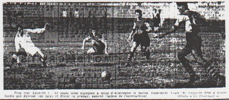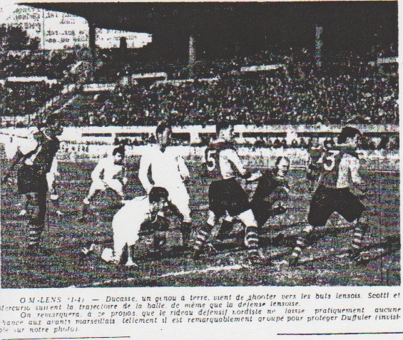 Près de 15.000 spectateurs avaient tenu à assister à ce match de "reprise" puisque l'O.M. s'était produit à l'extérieur depuis le 14 octobre, date de la venue du F.C. Metz. Ils étaient là, prêt à s'enthousiasmer en considérant tout à la fois l'excellente performance accomplie par les Marseillais à Reims et la valeur intrinsèque de leurs avants adversaires du jour, les Lensois. Encouragée par le soleil, oubliant le vent qui soufflait dans le sens longitudinal du champ de jeu, la foule apprit avec satisfaction que Jean Robin allait aligner Molla, les craintes dont avait fait l'objet la participation du Port de Boucain s'avérant ainsi vaines. Aussi, quand M. Devillers appela les deux équipes, les présents se calèrent-ils dans leurs sièges, attendant avec impatience les premières escarmouches. Leonetti et Duffuler Opportunistes Les choses débutèrent de façon prometteuse pour l'O.M. ; Scotti lança Andersson dès la première minute. Sans résultat pourtant : le jeu de tête n'est pas le point fort du canonnier de Mazargues... À la 6me minute encore, le jeune Leonetti lança Andersson auquel Duffuler, promptement, souffla littéralement la balle. Puis, à la 11me, après un arrêt de Domingo, Leonetti manqua l'objectif. Dix minutes plus tard le keeper des "sang et or" eut encore deux occasions de se signaler : d'abord sur un effort de Ducasse, servi par Andersson, ensuite devant Scotti. Si avant la pause Leonetti se signala par un tir qui lui offrit un corner sur lequel il se fit longuement applaudir et si Andersson plaça un heading à côté du montant, Lens n'avait pas pendant ce temps, regardé jouer l'O.M. Nous avions eu, en effet, à noter sur nos tablettes, de fort dangereuses actions de Wisneski (10', 26' et 34'), de Louis (14') de Johansson (15') |