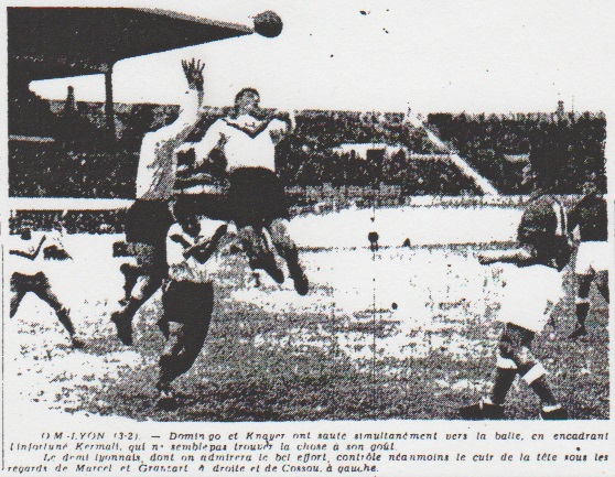 LES MARSEILLAIS FONT FEU DES QUATRE FERS DANS LE MATCH "DE LA RESURRECTION", QUI SE TERMINE DANS UNE AMBIANCE SUD-AMERICAINE L'O.M. triomphe "au sprint " du onze Lyonnais (3-2) Dans une fin de match passionnante et acharnée |