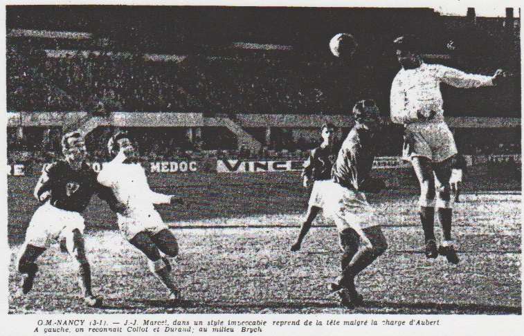 Comme il fallait s'y attendre, la grande foule, en ce jour de Noël, n'avait pas envahi le Stade Vélodrome pour venir assister au match de championnat entre l'O.M. et Nancy. En effet, à peine 8.415 spectateurs (recette 2.117.650 francs) s'étaient rendus dans l'arène du boulevard Michelet pouvoir le débat entre les Marseillais et les Lorrains. Les absents eurent-ils tort ? Oui sans doute car les deux équipes se livrèrent, tout au long du match, un combat âpre et rapide qui se termina en fin de compte par le succès de l'O.M. Mais avant d'arracher le gain de la rencontre, les joueurs olympiens durent cravacher ferme pour mettre à mal la coriace défense de Nancy, renforcée pour la circonstance par Piantoni. Mais ne mettons pas la charrue avant les boeufs et revenons à cette confrontation, animé, plaisante et de surcroît assez équilibré dans l'ensemble. À l'appel de l'arbitre, M. Bondon, les deux teams se présentent dans les formations annoncées, c'est-à-dire Nancy sans Bottolier ni Villermin, l'O.M. sans Palluch ni Mercurio. Dès le coup d'envoi, les Phocéens se montrent entreprenants par Andersson qui ouvre sur la tête de Durand. Le heading de l'ailier droit trouve cependant Nagy à la parade (8me minute). Le jeu sans être d'une rapidité excessive est néanmoins assez vite. Nancy lance dans la bataille son trio de pointe, tandis que Piantoni opère nettement en retrait. Une combinaison Mesas, Curyl, Andersson se termine par un shoot de ce dernier que Tazoppe met en corner (19me minute). L'O.M. domine dans l'ensemble et à la 24me minute, Andersson est sur le point d'ouvrir la marque sur un excellent service de Curyl, mais Tazoppe, encore lui dégage in extremis. Puis à la 30me minute, un centre d'Andersson aboutit sur les pieds de Leonetti. Le jeune inter tirs. On croit au but lorsque Nagy, dans une belle détente, bloque le cuir. Nancy ne possède que par contre-attaques et subit la loi adverse. Deux actions d'Andersson (31me et 37me minutes) et un shoot fulgurant de ce même joueur (43me minute) ne peuvent toutefois prendre en défaut la solide défense Lorraine. Et de ce fait l'on arrive à la mi-temps sur le score nul (0-0). Nancy plus entreprenant Dès la reprise, Nancy qui à pris quelque confiance, met à son tour à contribution Marcel Domingo. Le portier marseillais, dans une forme éblouissante, sauve sa cage sur une dangereuse action de Deladerriere (46me minute) et sur un tir d'une puissance extrême de Piantoni (55me minute). Trois minutes plus tard, il plonge dans les pieds de Dorsini, l'empêchant ainsi d'ouvrir le score pour Nancy. |