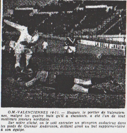 Quand, à la 66e minute du match O.M. - V.A., Cesari prolongea de du front vers Plewa une balle shootée sur le corner de paluche avait concédé pour se débarrasser de ce même Cesari, on crut que les Nordistes allaient gagner la rencontre dont les Méridionaux étaient les favoris. Malheureusement pour les siens, Plewa qui fut d'une insigne faiblesse durant toute la partie, gaspilla lamentablement cette balle de match Le tableau d'affichage traduisait alors par 1 à 1 l'incertitude des débats dominés depuis leur reprise par les Valenciennois. Huit minutes plus tard, en effet, Vescovali trompa Hugues, atteignant terriblement les défenseurs visiteurs au moral et dessinant une victoire que Marcel puis Jensen parachevèrent non sans une certaine sévérité. V. A. ne méritait pas un échec aussi nettement chiffrés, c'est ce que l'on peut retenir au terme d'une confrontation marquée par la carence totale des avants des "rouges" et le passage à vide général des "blancs". Ce passage à vide, qu'illustra une copieuse collection d'erreurs défensives, eut coûté fort cher aux locaux si Domergue n'avait pas dû compter sur leur seul demi Chiarelli pour alerter Domingo. Cette stérilité nordiste est d'autant plus à regretter qu'à l'image de Hugues, pétri de qualités, la défense du capitaine Krysse a les moyens de se faire respecter. Bilan quelque peu heureux donc, pour les olympiens qui affichèrent des lacunes graves. |
