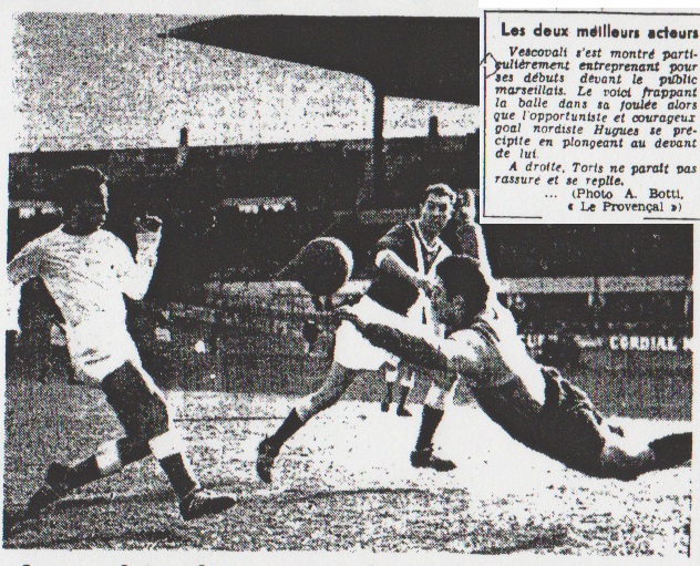 "Le goal de Valenciennes a été transcendant. Sans lui, le score eut été plus élevé. "Certes, nous notre part, nous n'avons bien joué que pendant un quart d'heure, mais ces quinze minutes, je l'avoue, m'ont largement dédommagé." Jensen, Vescovali et Mesas ont été à mon avis, parmi les meilleurs". Et, bien entendu, le jeune ailier gauche était très entouré. Cela d'ailleurs ne lui faisait pas perdre la tête et il nous avoua, avec la timidité d'un collégien : "J'avais peur de mal faire pour mes débuts devant le grand public du Stade-Vélodrome. Je tense, toutefois, que je ne lai pas trop déçu". Non, Vescovali, vous n'avez pas du tout déçu les Marseillais, au contraire, car beaucoup ne s'attendaient pas a voir une telle maturité chez un débutant ou presque. |