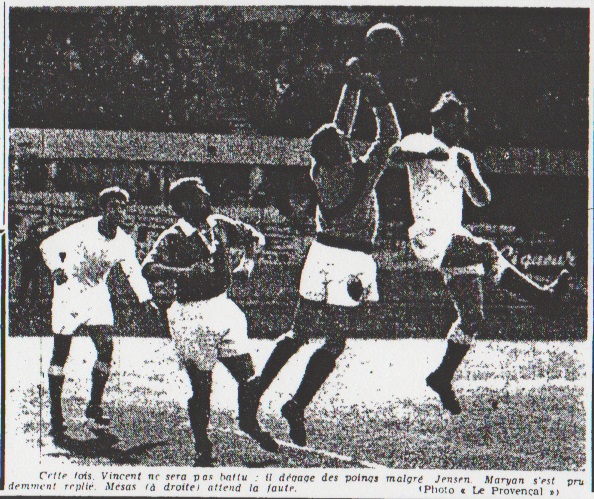 Demi plus tard, les Méridionaux sont bien près d'allonger la note : Curyl de la tête, projette au-dessus de la barre le "cuir" que Scotti lui avait adressé sur coup franc. À la 31me minute, Célestin Oliver dégage miraculeusement en corner une balle shootée par Curyl décidément peu heureux. La chance de Sedan Alors que l'on attend sans émotion la mi-temps, en espérant que cela changera - que Dugauguez 'frictionnera" ses poulains - Breny bénéficie d'un coup de pied de coin. La balle parvient dans un paquet de joueurs et Carpentier surgit en trombe... pour échouer sur le poteau. Breny reprend. À côté cette fois. Sedan a perdu sa chance et le jeu se déroule sur le même rythme sans beaucoup de conviction jusqu'à la pause. Tête de Jensen troisième but La seconde mi-temps débute sans surprise et à 51me minute, Lemasson empêche in extremis Andersson de tenter le but. À la 52me minute, Scotti attire Vincent et rate l'objectif. Sept minutes plus tard, les supporters marseillais tremblent : Célestin Oliver tire et Domingo arrête après n'avoir pu que corriger la prajectoire. Son vis-à-vis Vincent doit plonger à la 60 sur une passe en retrait d'Eloy. À la 65me minute, cette fois Mercurio sollicité par Curyl centre sur Jensen. L'ailier droit des "blancs" se détend, perd l'équilibre et, tout en culbutant, pousse la balle hors de portée de Vincent : O.M. : 3 - Sedan : 0. La fin du match, malgré le forcing de Sedan, n'apportera rien : l'O.M. a gagné au petit trot devant un Sedan méconnaissable. Georges LEOST |